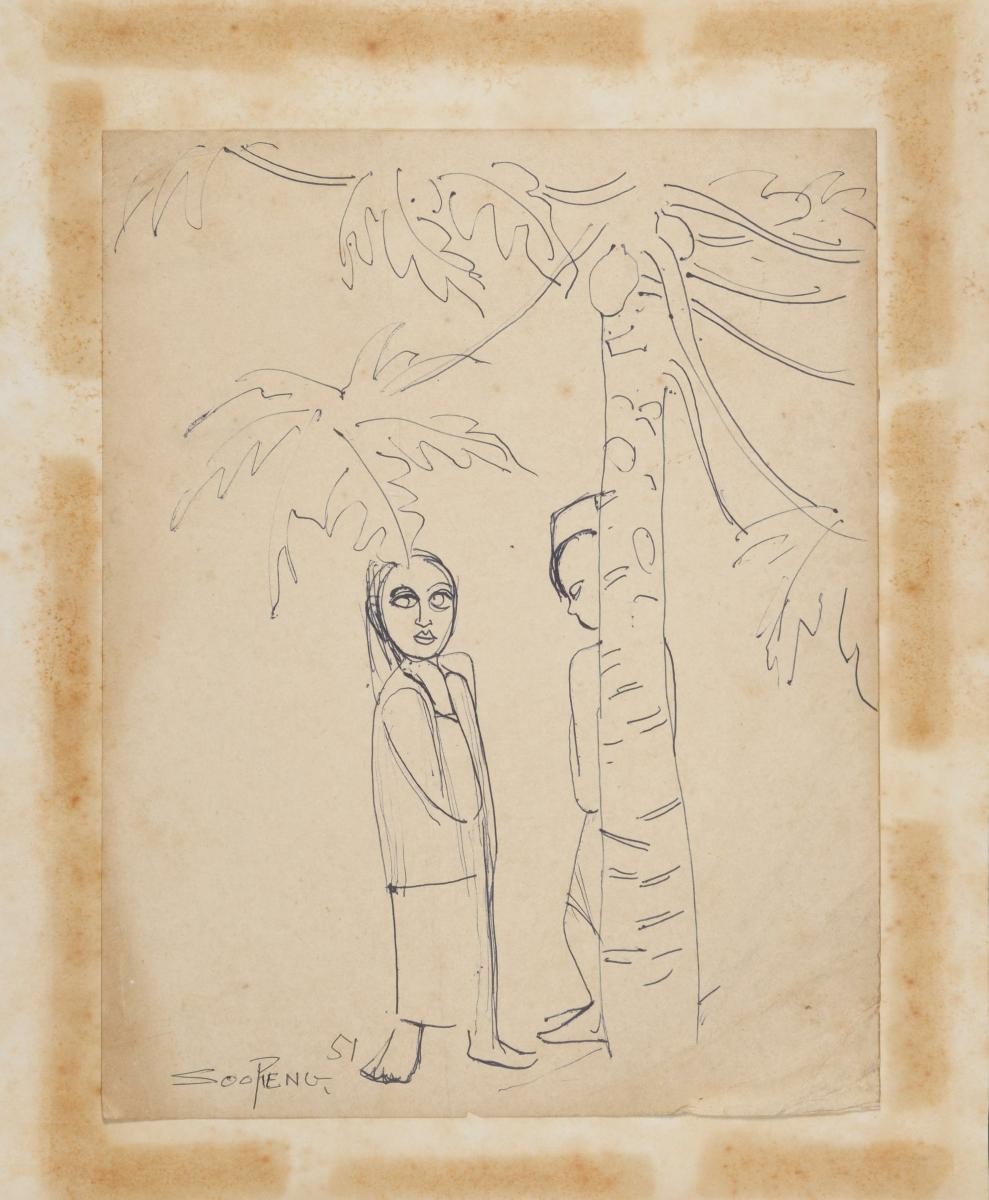 Cheong Soo Pieng, born in Xiamen (Amoy), China in 1914, was accomplished in ink painting having received training in art at Xiamen Academy of Art and Xinhua Academy of Fine Arts in Shanghai. A year after his arrival in Singapore in 1946, he started lecturing at Nanyang Academy of Fine Arts and stayed on till 1961. However it was a trip taken with fellow artists Chen Chong Swee, Chen Wen Hsi and Liu Kang in 1952 to Bali to seek inspiration and seek fresh subject matter that sealed his standing as a pivotal figure in Singapore’s modern art development. He was part of a group of artists that attempted to articulate a style identifiable and pertinent to post-war Singapore, then known collectively with Malaysia, as Malaya. This style, later crystallized as the Nanyang style, provided a foundation upon which future generations of artists learned and expanded on. A key element of the Nanyang style is the synthesis of Chinese pictorial elements and the diverse formalistic qualities from the School of Paris. In 1962, the Singapore government awarded Cheong with the Meritorious Service Medal. He passed away in 1983.‘Untitled (House Hidden behind The Trees)’ is an example of Cheong’s scrutiny of and interest in the regional landscape.
