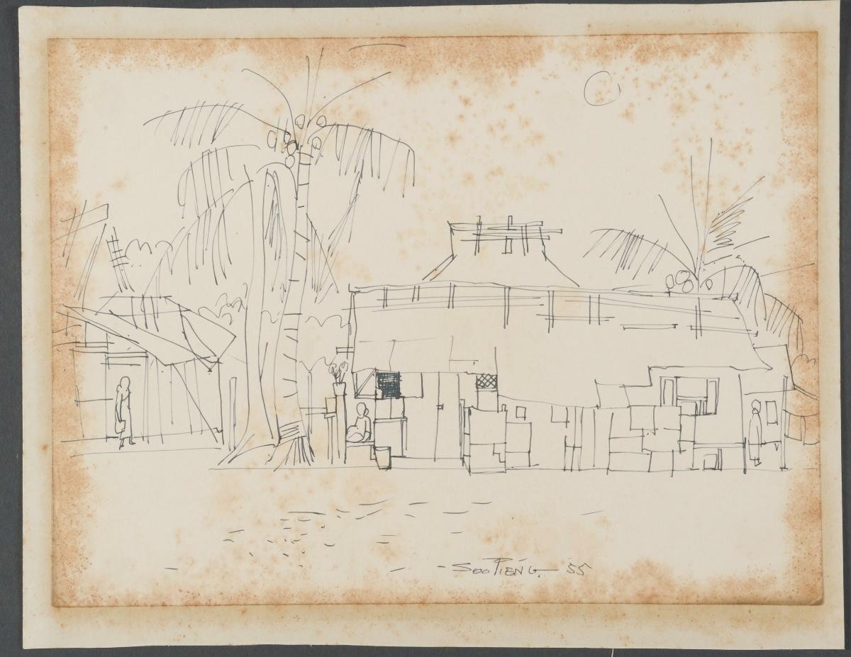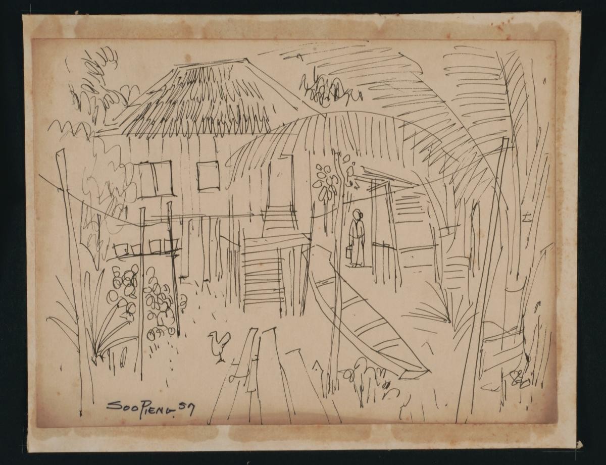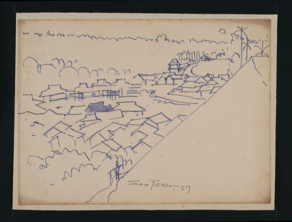 Cheong Soo Pieng, born in Xiamen (Amoy), China in 1914, was accomplished in ink painting having received training in art at Xiamen Academy of Art and Xinhua Academy of Fine Arts in Shanghai. A year after his arrival in Singapore in 1946, he started lecturing at Nanyang Academy of Fine Arts and stayed on till 1961. However it was a trip taken with fellow artists Chen Chong Swee, Chen Wen Hsi and Liu Kang in 1952 to Bali to seek inspiration and seek fresh subject matter that sealed his standing as a pivotal figure in Singapore’s modern art development. He was part of a group of artists that attempted to articulate a style identifiable and pertinent to post-war Singapore, then known collectively with Malaysia, as Malaya. This style, later crystallized as the Nanyang style, provided a foundation upon which future generations of artists learned and expanded on. A key element of the Nanyang style is the synthesis of Chinese pictorial elements and the diverse formalistic qualities from the School of Paris. In 1962, the Singapore government awarded Cheong with the Meritorious Service Medal. He passed away in 1983.‘Untitled (Scattered Village Homes)’, drawn from a high point, is an example of Cheong’s interest in the regional landscape.