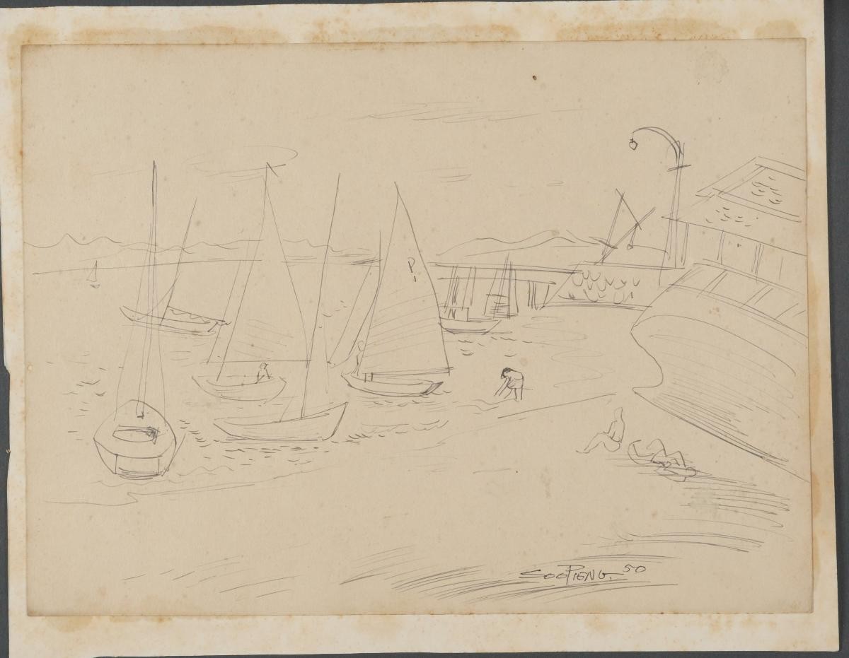 Cheong Soo Pieng, born in Xiamen (Amoy), China in 1914, was accomplished in ink painting having received training in art at Xiamen Academy of Art and Xinhua Academy of Fine Arts in Shanghai. A year after his arrival in Singapore in 1946, he started lecturing at Nanyang Academy of Fine Arts and stayed on till 1961. However it was a trip taken with fellow artists Chen Chong Swee, Chen Wen Hsi and Liu Kang in 1952 to Bali to seek inspiration and seek fresh subject matter that sealed his standing as a pivotal figure in Singapore’s modern art development. He was part of a group of artists that attempted to articulate a style identifiable and pertinent to post-war Singapore, then known collectively with Malaysia, as Malaya. This style, later crystallized as the Nanyang style, provided a foundation upon which future generations of artists learned and expanded on. A key element of the Nanyang style is the synthesis of Chinese pictorial elements and the diverse formalistic qualities from the School of Paris. In 1962, the Singapore government awarded Cheong with the Meritorious Service Medal. He passed away in 1983.‘Untitled (Sail Boats at Rest)’ is an example of Cheong’s scrutiny of and interest in the regional landscape.