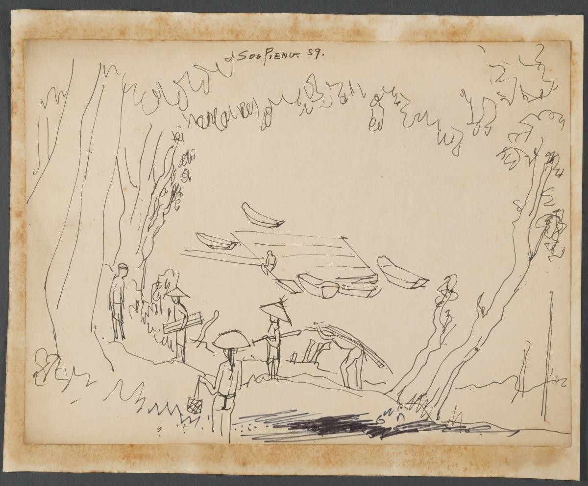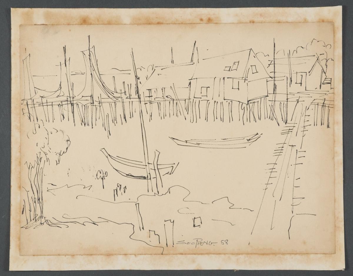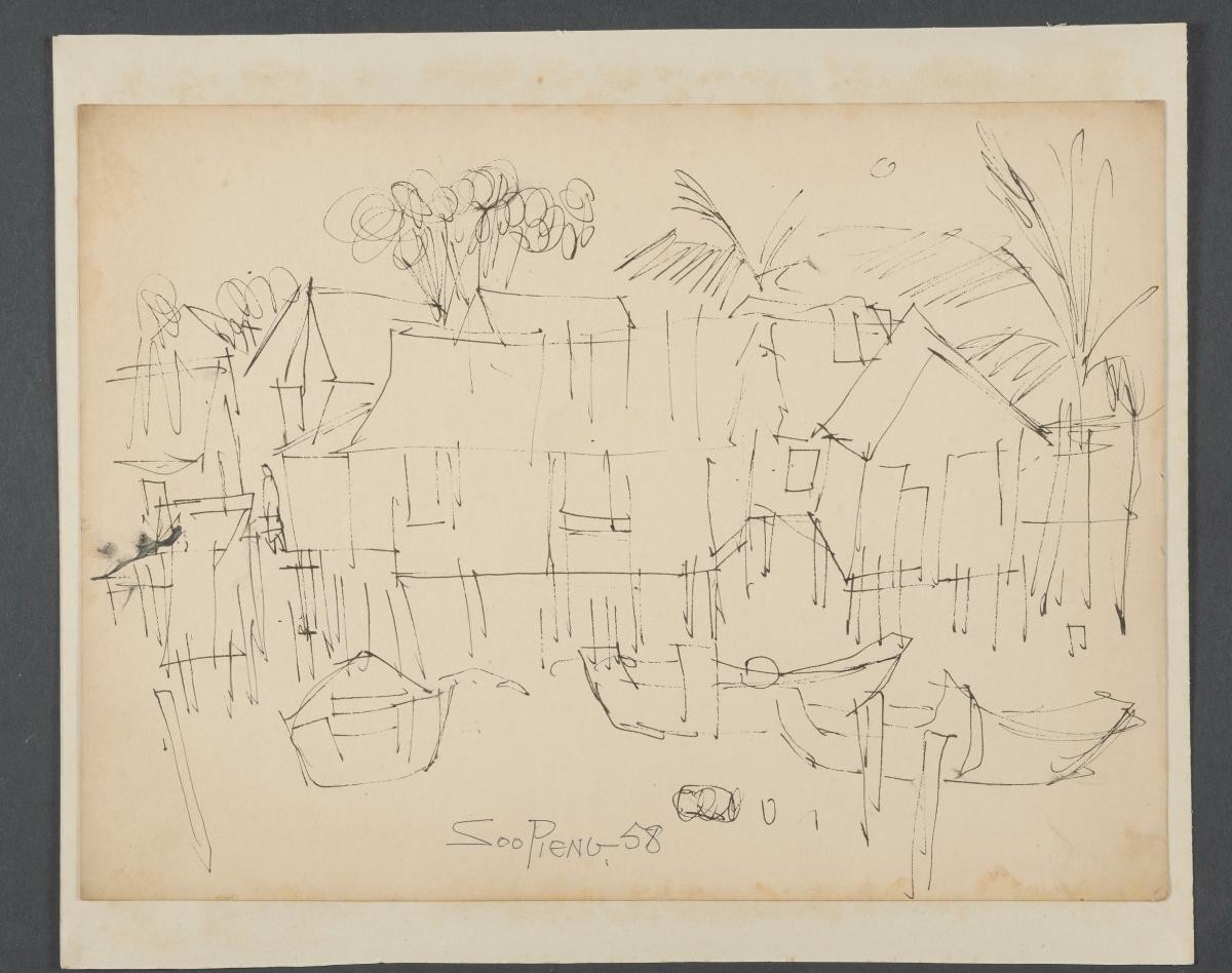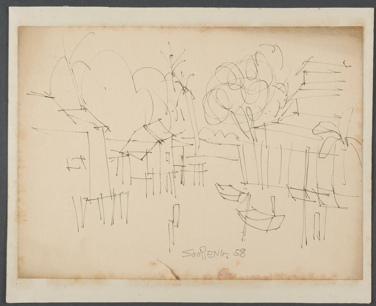 Cheong Soo Pieng, born in Xiamen (Amoy), China in 1914, was accomplished in ink painting having received training in art at Xiamen Academy of Art and Xinhua Academy of Fine Arts in Shanghai. A year after his arrival in Singapore in 1946, he started lecturing at Nanyang Academy of Fine Arts and stayed on till 1961. However it was a trip taken with fellow artists Chen Chong Swee, Chen Wen Hsi and Liu Kang in 1952 to Bali to seek inspiration and seek fresh subject matter that sealed his standing as a pivotal figure in Singapore’s modern art development. He was part of a group of artists that attempted to articulate a style identifiable and pertinent to post-war Singapore, then known collectively with Malaysia, as Malaya. This style, later crystallized as the Nanyang style, provided a foundation upon which future generations of artists learned and expanded on. A key element of the Nanyang style is the synthesis of Chinese pictorial elements and the diverse formalistic qualities from the School of Paris. In 1962, the Singapore government awarded Cheong with the Meritorious Service Medal. He passed away in 1983.‘Untitled (Trees with a Sampan)’, which depicts waterlilies growing in a pond in the foreground, is one of many idyllic scenes Cheong sketched during his travel around Southeast Asia. A ‘sampan’ is a small wooden boat.