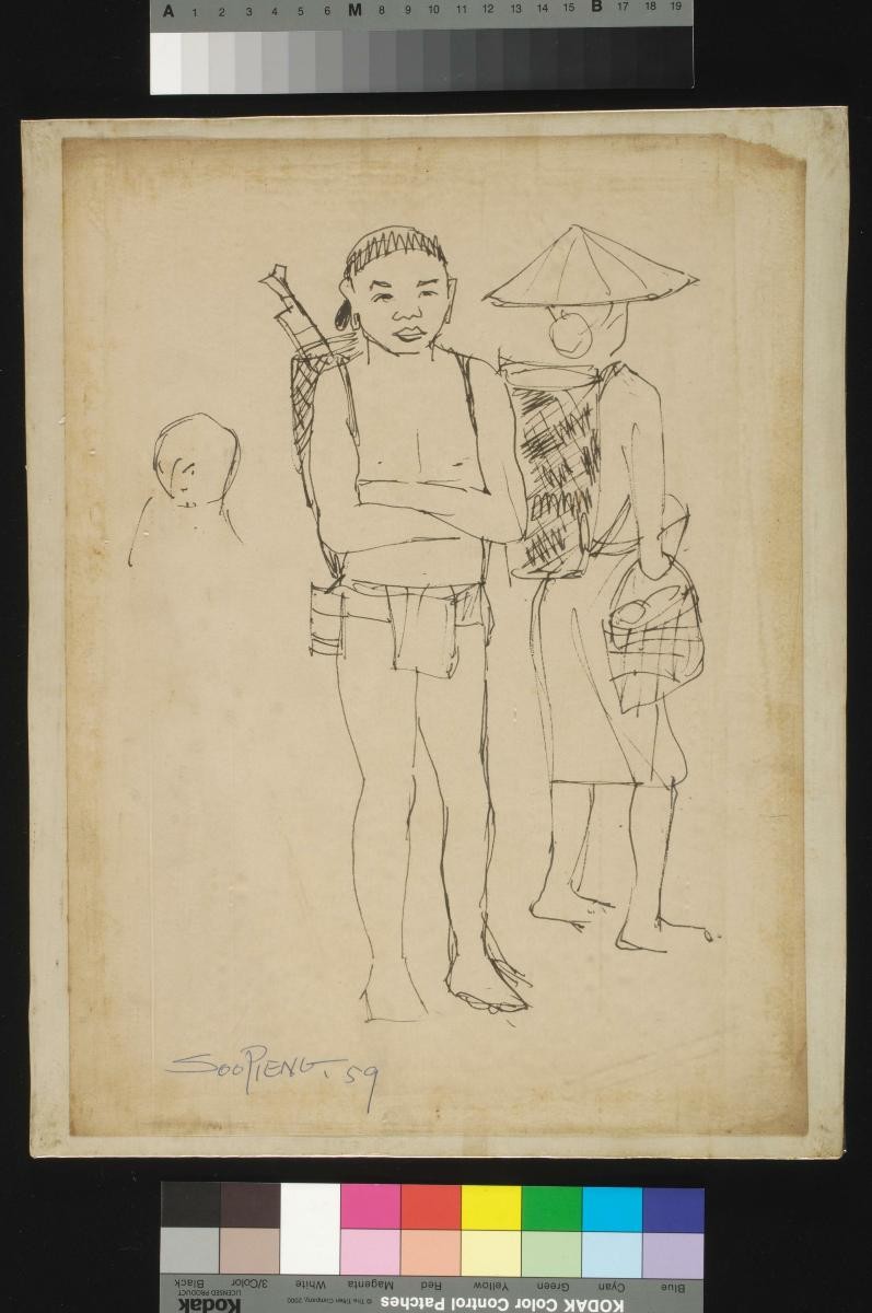 Cheong Soo Pieng, born in Xiamen (Amoy), China in 1914, was accomplished in ink painting having received training in art at Xiamen Academy of Art and Xinhua Academy of Fine Arts in Shanghai. A year after his arrival in Singapore in 1946, he started lecturing at Nanyang Academy of Fine Arts and stayed on till 1961. However it was a trip taken with fellow artists Chen Chong Swee, Chen Wen Hsi and Liu Kang in 1952 to Bali to seek inspiration and seek fresh subject matter that sealed his standing as a pivotal figure in Singapore’s modern art development. He was part of a group of artists that attempted to articulate a style identifiable and pertinent to post-war Singapore, then known collectively with Malaysia, as Malaya. This style, later crystallized as the Nanyang style, provided a foundation upon which future generations of artists learned and expanded on. A key element of the Nanyang style is the synthesis of Chinese pictorial elements and the diverse formalistic qualities from the School of Paris. In 1962, the Singapore government awarded Cheong with the Meritorious Service Medal. He passed away in 1983.‘Untitled (Dayak Woman Standing with Arms Crossed)’ is one of many figurative studies of the ethnic group Cheong produced during his trip to Borneo in 1959 that eventually informed his art and iconography.