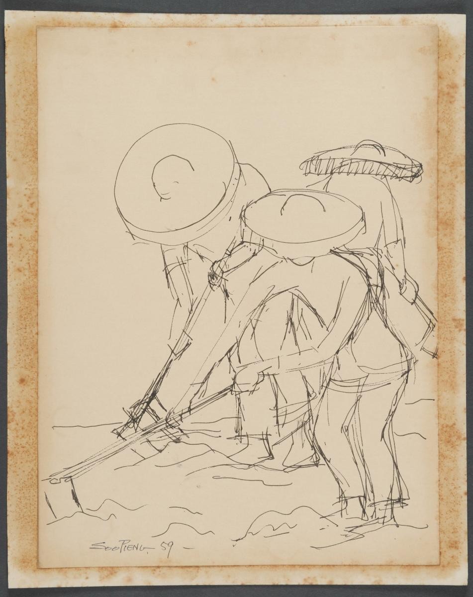 Cheong Soo Pieng, born in Xiamen (Amoy), China in 1914, was accomplished in ink painting having received training in art at Xiamen Academy of Art and Xinhua Academy of Fine Arts in Shanghai. A year after his arrival in Singapore in 1946, he started lecturing at Nanyang Academy of Fine Arts and stayed on till 1961. However it was a trip taken with fellow artists Chen Chong Swee, Chen Wen Hsi and Liu Kang in 1952 to Bali to seek inspiration and seek fresh subject matter that sealed his standing as a pivotal figure in Singapore’s modern art development. He was part of a group of artists that attempted to articulate a style identifiable and pertinent to post-war Singapore, then known collectively with Malaysia, as Malaya. This style, later crystallized as the Nanyang style, provided a foundation upon which future generations of artists learned and expanded on. A key element of the Nanyang style is the synthesis of Chinese pictorial elements and the diverse formalistic qualities from the School of Paris. In 1962, the Singapore government awarded Cheong with the Meritorious Service Medal. He passed away in 1983.‘Untitled (Digging with A Shovel)’ is an example of Cheong’s scrutiny of and interest in the people of the region and their activities.