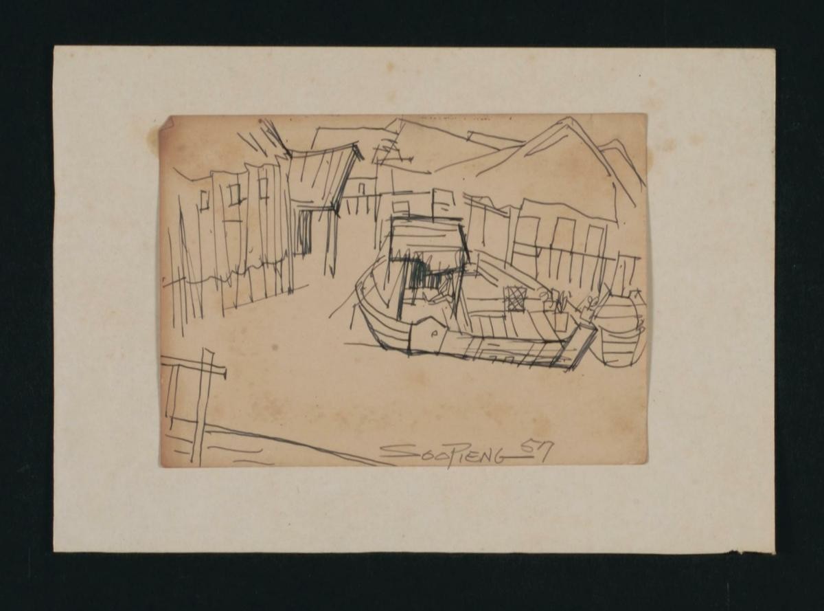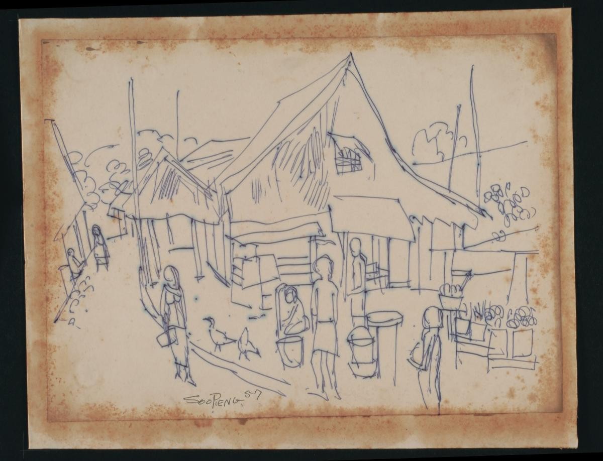 Cheong Soo Pieng, born in Xiamen (Amoy), China in 1914, was accomplished in ink painting having received training in art at Xiamen Academy of Art and Xinhua Academy of Fine Arts in Shanghai. A year after his arrival in Singapore in 1946, he started lecturing at Nanyang Academy of Fine Arts and stayed on till 1961. However it was a trip taken with fellow artists Chen Chong Swee, Chen Wen Hsi and Liu Kang in 1952 to Bali to seek inspiration and seek fresh subject matter that sealed his standing as a pivotal figure in Singapore’s modern art development. He was part of a group of artists that attempted to articulate a style identifiable and pertinent to post-war Singapore, then known collectively with Malaysia, as Malaya. This style, later crystallized as the Nanyang style, provided a foundation upon which future generations of artists learned and expanded on. A key element of the Nanyang style is the synthesis of Chinese pictorial elements and the diverse formalistic qualities from the School of Paris. In 1962, the Singapore government awarded Cheong with the Meritorious Service Medal. He passed away in 1983.‘Untitled (Village Entrance)’ is one of Cheong’s many sketches of regional cultures and landscapes; it shows the rustic setting of a traditional wooden house within an enclosure made of mat.