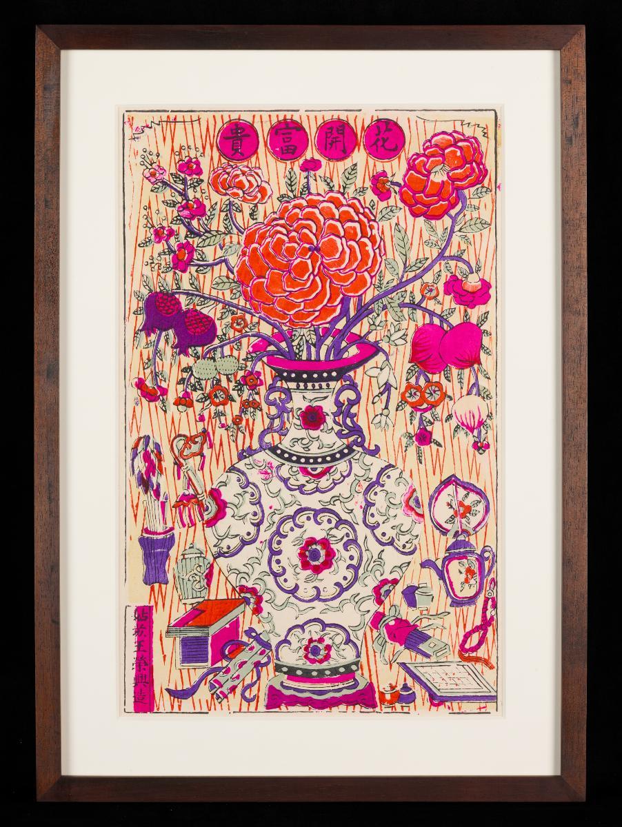 Chinese woodblock print depicting ladies with children and a vase of peonies