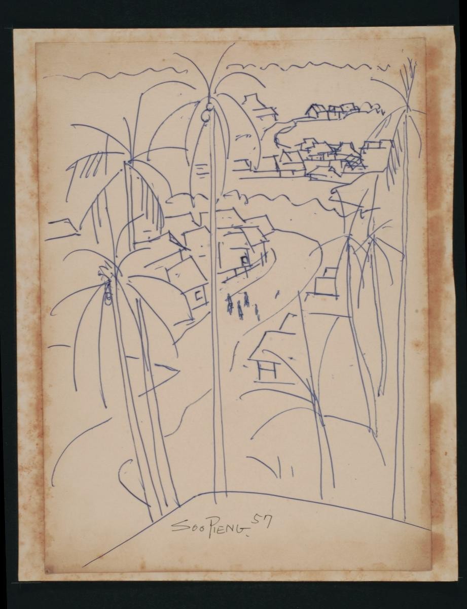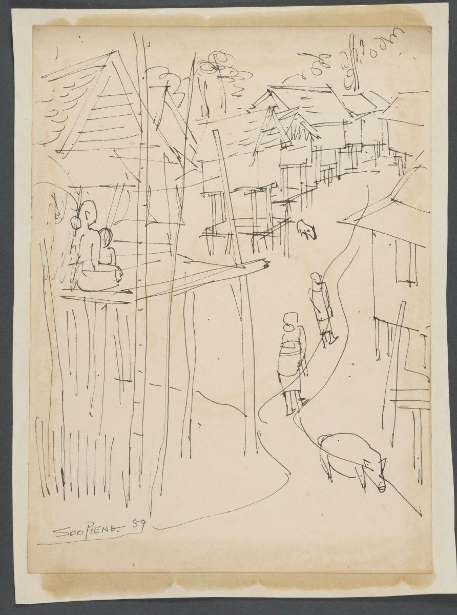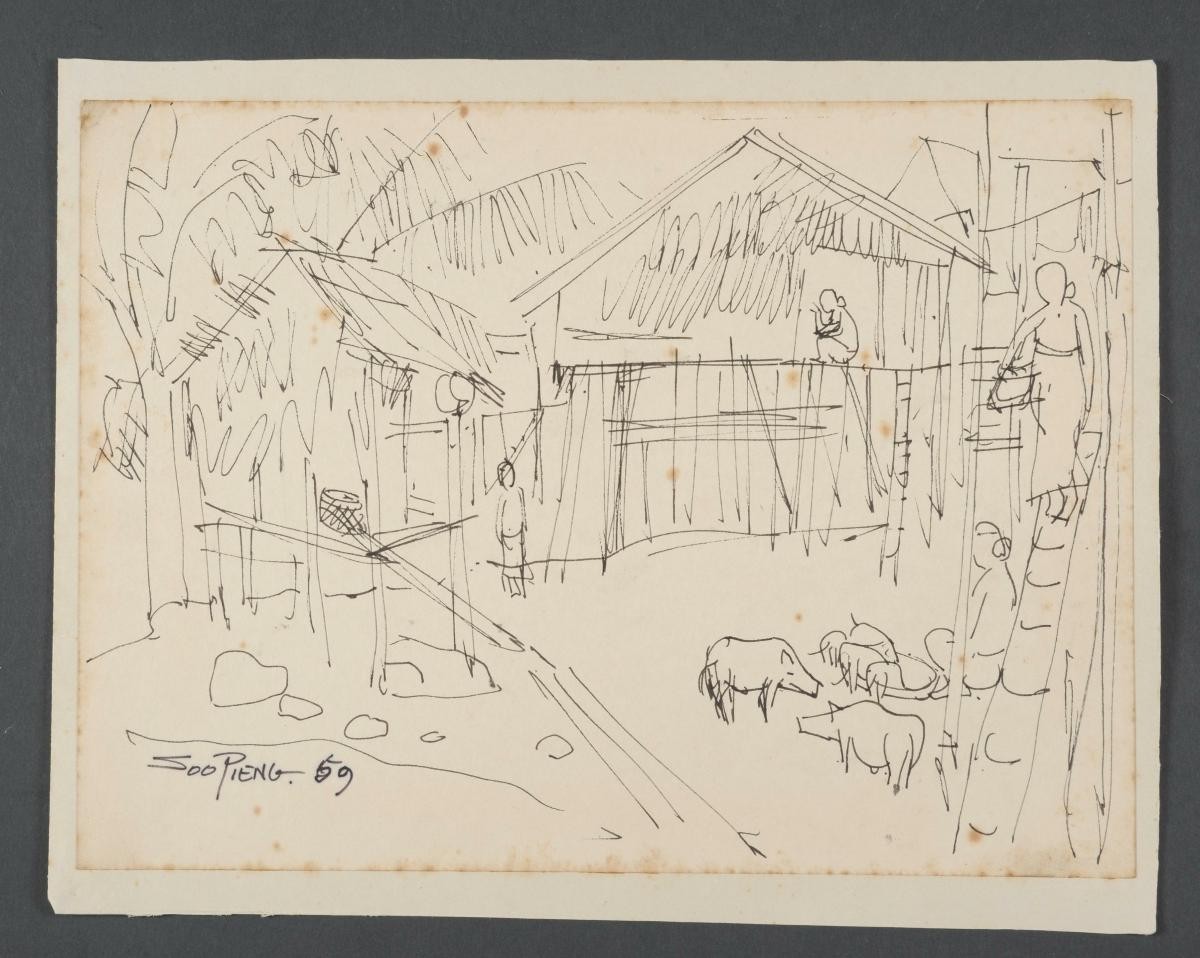 Cheong Soo Pieng, born in Xiamen (Amoy), China in 1914, was accomplished in ink painting having received training in art at Xiamen Academy of Art and Xinhua Academy of Fine Arts in Shanghai. A year after his arrival in Singapore in 1946, he started lecturing at Nanyang Academy of Fine Arts and stayed on till 1961. However it was a trip taken with fellow artists Chen Chong Swee, Chen Wen Hsi and Liu Kang in 1952 to Bali to seek inspiration and seek fresh subject matter that sealed his standing as a pivotal figure in Singapore’s modern art development. He was part of a group of artists that attempted to articulate a style identifiable and pertinent to post-war Singapore, then known collectively with Malaysia, as Malaya. This style, later crystallized as the Nanyang style, provided a foundation upon which future generations of artists learned and expanded on. A key element of the Nanyang style is the synthesis of Chinese pictorial elements and the diverse formalistic qualities from the School of Paris. In 1962, the Singapore government awarded Cheong with the Meritorious Service Medal. He passed away in 1983.‘Untitled (Village with Four Boars)’ is an example of Cheong’s scrutiny of and interest in depicting the regional landscape. Collectively his many sketches provide useful entry points to understand the sources of his iconography.
