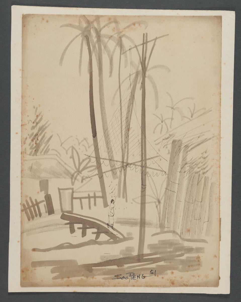 Cheong Soo Pieng, born in Xiamen (Amoy), China in 1914, was accomplished in ink painting having received training in art at Xiamen Academy of Art and Xinhua Academy of Fine Arts in Shanghai. A year after his arrival in Singapore in 1946, he started lecturing at Nanyang Academy of Fine Arts and stayed on till 1961. However it was a trip taken with fellow artists Chen Chong Swee, Chen Wen Hsi and Liu Kang in 1952 to Bali to seek inspiration and seek fresh subject matter that sealed his standing as a pivotal figure in Singapore’s modern art development. He was part of a group of artists that attempted to articulate a style identifiable and pertinent to post-war Singapore, then known collectively with Malaysia, as Malaya. This style, later crystallized as the Nanyang style, provided a foundation upon which future generations of artists learned and expanded on. A key element of the Nanyang style is the synthesis of Chinese pictorial elements and the diverse formalistic qualities from the School of Paris. In 1962, the Singapore government awarded Cheong with the Meritorious Service Medal. He passed away in 1983.‘Untitled (Coconut Trees)’ is a study of the ubiquitous coconut tree.