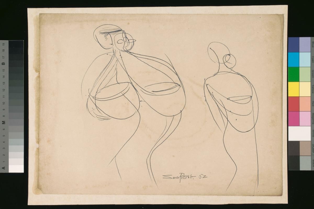 Cheong Soo Pieng, born in Xiamen (Amoy), China in 1914, was accomplished in ink painting having received training in art at Xiamen Academy of Art and Xinhua Academy of Fine Arts in Shanghai. A year after his arrival in Singapore in 1946, he started lecturing at Nanyang Academy of Fine Arts and stayed on till 1961. However it was a trip taken with fellow artists Chen Chong Swee, Chen Wen Hsi and Liu Kang in 1952 to Bali to seek inspiration and seek fresh subject matter that sealed his standing as a pivotal figure in Singapore’s modern art development. He was part of a group of artists that attempted to articulate a style identifiable and pertinent to post-war Singapore, then known collectively with Malaysia, as Malaya. This style, later crystallized as the Nanyang style, provided a foundation upon which future generations of artists learned and expanded on. A key element of the Nanyang style is the synthesis of Chinese pictorial elements and the diverse formalistic qualities from the School of Paris. In 1962, the Singapore government awarded Cheong with the Meritorious Service Medal. He passed away in 1983.A keen observer of people, Cheong studies the grouping, poses and gestures of a small gathering in ‘Untitled (Four Women from The Back)’.