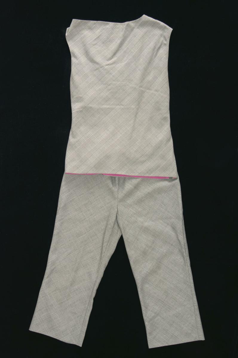 This pant suit was designed by the late Italian fashion designer Gianni Versace. This label together with other famous brands such as Giogio Armani, Chanel, Krizia and D&G were very popular in Singapore from the 1980s onwards. As Singaporean women moved up the corporate ladder, their spending power increased so they could afford luxurious goods. They were thus more willing to spend on designer clothes to reflect their wealth and status.Gianni Versace founded the Gianni Versace S.p.A., an international fashion house. He was influenced by Andy Warhol, a leading figure in pop art, and his works also reflect elements of Ancient Roman and Greek art as well as modern abstract art.