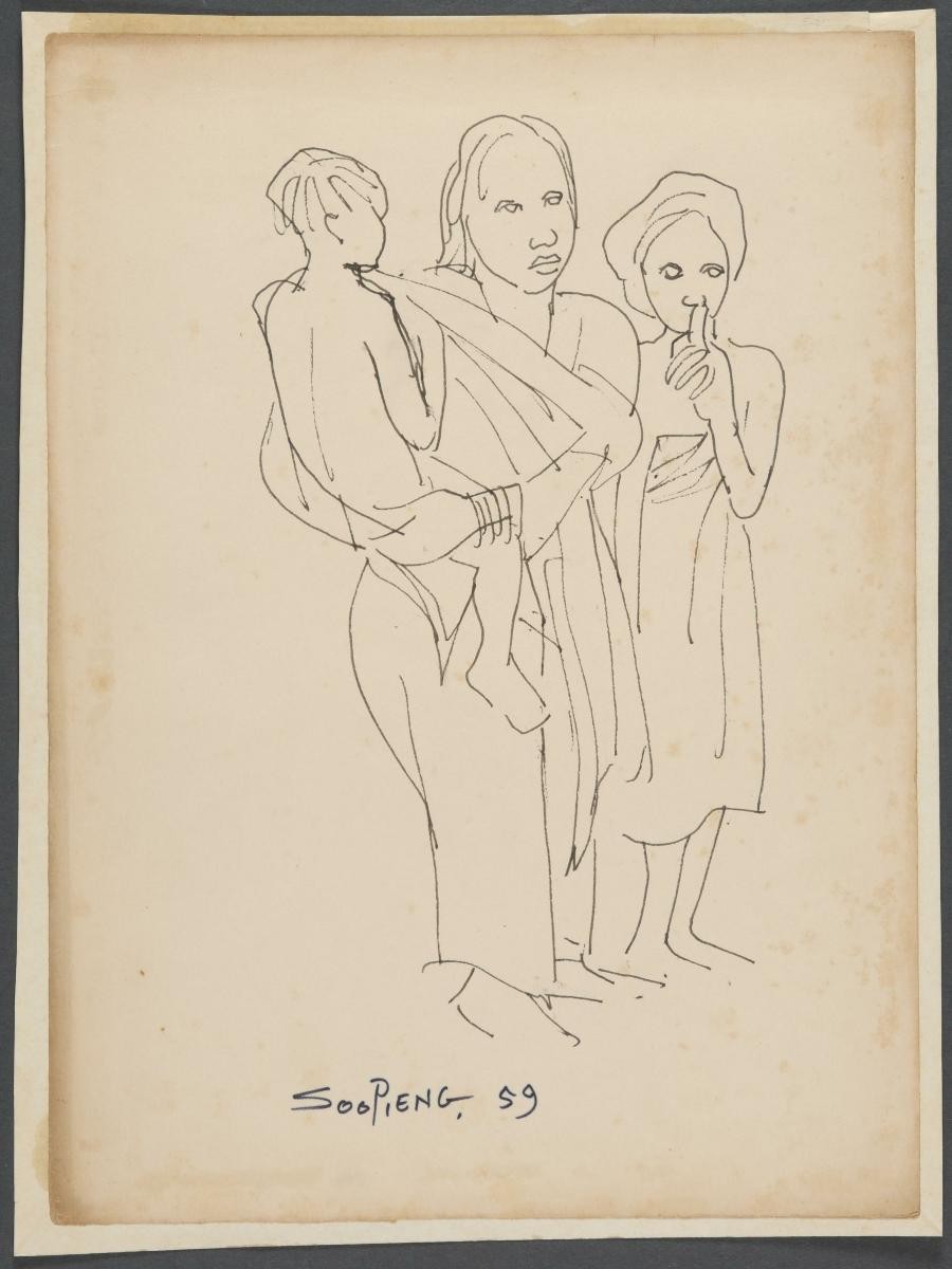 Cheong Soo Pieng, born in Xiamen (Amoy), China in 1914, was accomplished in ink painting having received training in art at Xiamen Academy of Art and Xinhua Academy of Fine Arts in Shanghai. A year after his arrival in Singapore in 1946, he started lecturing at Nanyang Academy of Fine Arts and stayed on till 1961. However it was a trip taken with fellow artists Chen Chong Swee, Chen Wen Hsi and Liu Kang in 1952 to Bali to seek inspiration and seek fresh subject matter that sealed his standing as a pivotal figure in Singapore’s modern art development. He was part of a group of artists that attempted to articulate a style identifiable and pertinent to post-war Singapore, then known collectively with Malaysia, as Malaya. This style, later crystallized as the Nanyang style, provided a foundation upon which future generations of artists learned and expanded on. A key element of the Nanyang style is the synthesis of Chinese pictorial elements and the diverse formalistic qualities from the School of Paris. In 1962, the Singapore government awarded Cheong with the Meritorious Service Medal. He passed away in 1983.‘Untitled (Two Women with Child)’ is one of many sketches Cheong produced of the people of Southeast Asia that provide entry points to understand the sources of his iconography.