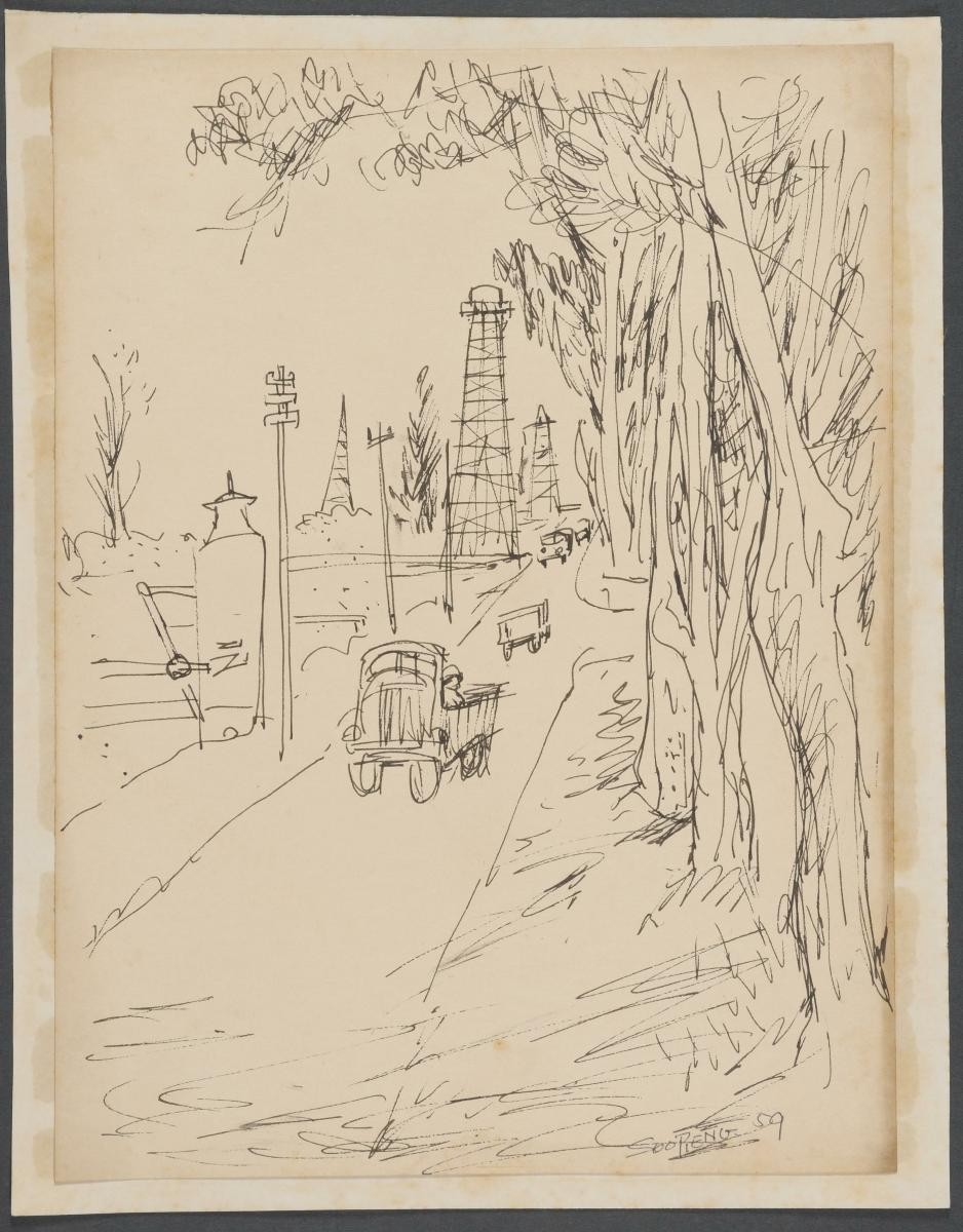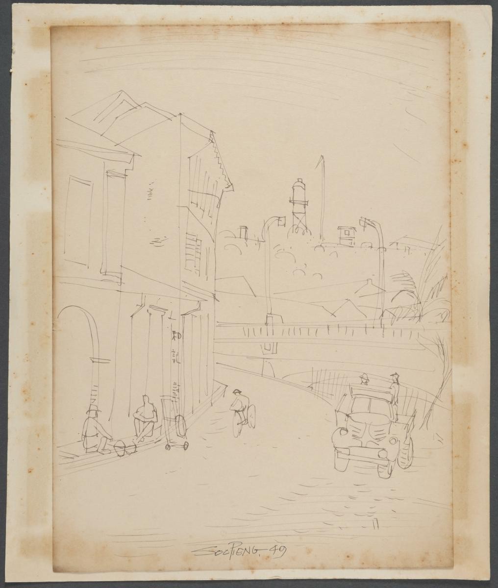 Cheong Soo Pieng, born in Xiamen (Amoy), China in 1914, was accomplished in ink painting having received training in art at Xiamen Academy of Art and Xinhua Academy of Fine Arts in Shanghai. A year after his arrival in Singapore in 1946, he started lecturing at Nanyang Academy of Fine Arts and stayed on till 1961. However it was a trip taken with fellow artists Chen Chong Swee, Chen Wen Hsi and Liu Kang in 1952 to Bali to seek inspiration and seek fresh subject matter that sealed his standing as a pivotal figure in Singapore’s modern art development. He was part of a group of artists that attempted to articulate a style identifiable and pertinent to post-war Singapore, then known collectively with Malaysia, as Malaya. This style, later crystallized as the Nanyang style, provided a foundation upon which future generations of artists learned and expanded on. A key element of the Nanyang style is the synthesis of Chinese pictorial elements and the diverse formalistic qualities from the School of Paris. In 1962, the Singapore government awarded Cheong with the Meritorious Service Medal. He passed away in 1983.As a keen observer with an interest in the development of Singapore and Malaya, Cheong has depicted many scenes that signify progress such as industrial and construction sites. ‘Untitled (Working by The River with Lorries)’ shows warehouses along a river’s bank with lorries ready to move goods away.