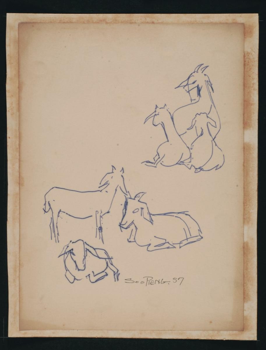 Cheong Soo Pieng, born in Xiamen (Amoy), China in 1914, was accomplished in ink painting having received training in art at Xiamen Academy of Art and Xinhua Academy of Fine Arts in Shanghai. A year after his arrival in Singapore in 1946, he started lecturing at Nanyang Academy of Fine Arts and stayed on till 1961. However it was a trip taken with fellow artists Chen Chong Swee, Chen Wen Hsi and Liu Kang in 1952 to Bali to seek inspiration and seek fresh subject matter that sealed his standing as a pivotal figure in Singapore’s modern art development. He was part of a group of artists that attempted to articulate a style identifiable and pertinent to post-war Singapore, then known collectively with Malaysia, as Malaya. This style, later crystallized as the Nanyang style, provided a foundation upon which future generations of artists learned and expanded on. A key element of the Nanyang style is the synthesis of Chinese pictorial elements and the diverse formalistic qualities from the School of Paris. In 1962, the Singapore government awarded Cheong with the Meritorious Service Medal. He passed away in 1983.'Untitled (Five Cows Resting)' is an indication that Cheong’s interest in the region also includes animals of the land.