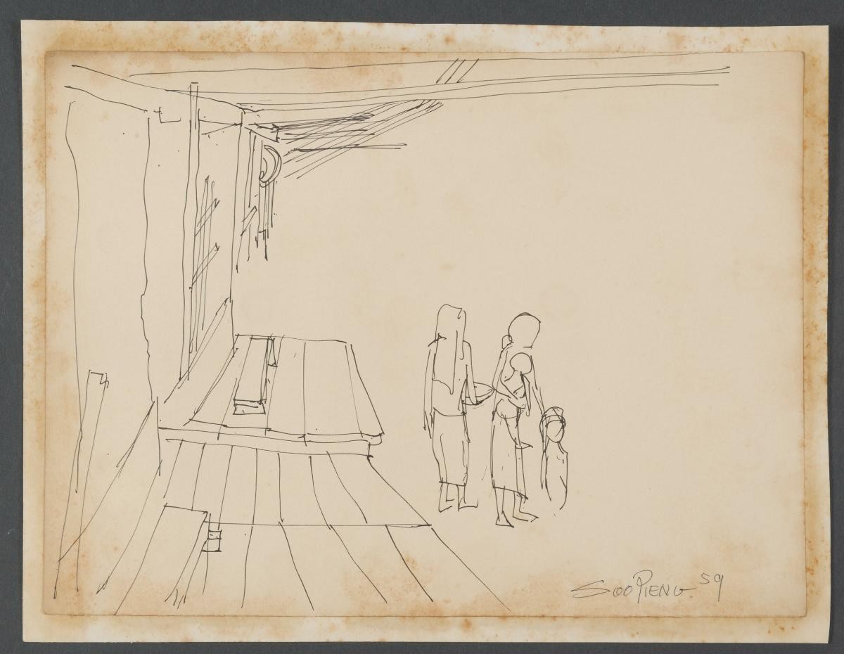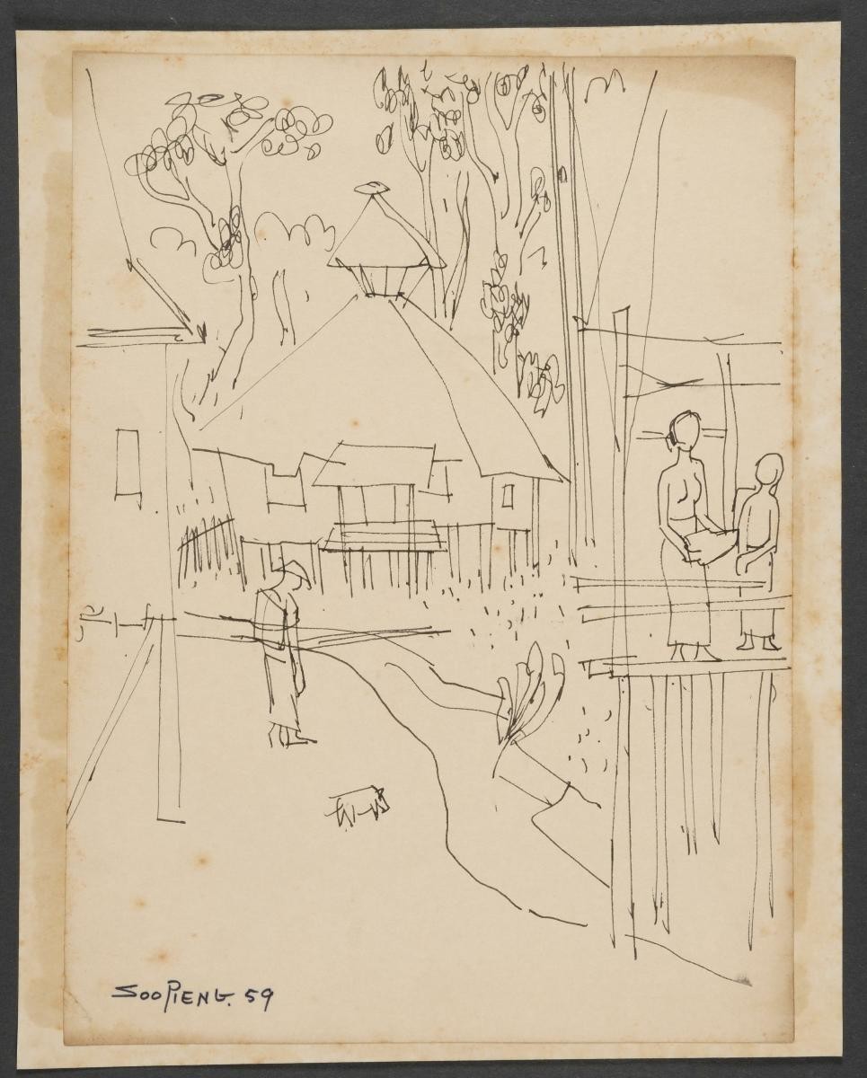 Cheong Soo Pieng, born in Xiamen (Amoy), China in 1914, was accomplished in ink painting having received training in art at Xiamen Academy of Art and Xinhua Academy of Fine Arts in Shanghai. A year after his arrival in Singapore in 1946, he started lecturing at Nanyang Academy of Fine Arts and stayed on till 1961. However it was a trip taken with fellow artists Chen Chong Swee, Chen Wen Hsi and Liu Kang in 1952 to Bali to seek inspiration and seek fresh subject matter that sealed his standing as a pivotal figure in Singapore’s modern art development. He was part of a group of artists that attempted to articulate a style identifiable and pertinent to post-war Singapore, then known collectively with Malaysia, as Malaya. This style, later crystallized as the Nanyang style, provided a foundation upon which future generations of artists learned and expanded on. A key element of the Nanyang style is the synthesis of Chinese pictorial elements and the diverse formalistic qualities from the School of Paris. In 1962, the Singapore government awarded Cheong with the Meritorious Service Medal. He passed away in 1983.‘Untitled (Family outside The Village)’, sketched during Cheong’s 1952 trip to Bali, is one of countless drawings he made of the rich social and cultural life of the islanders.