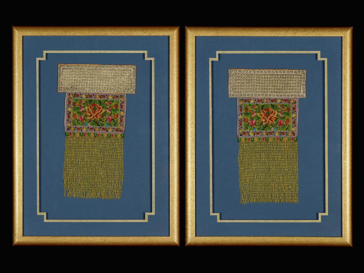 Curtain tie backs were common in the bridal chamber. This pair of curtain ties is adorned with auspicious motifs of phoenixes and peonies. Peonies represent springtime which is considered an auspicious time to get married. Phoenixes are symbols of high virtue and grace. When depicted as a pair, the phoenixes also represent happiness and good relations in the marriage.