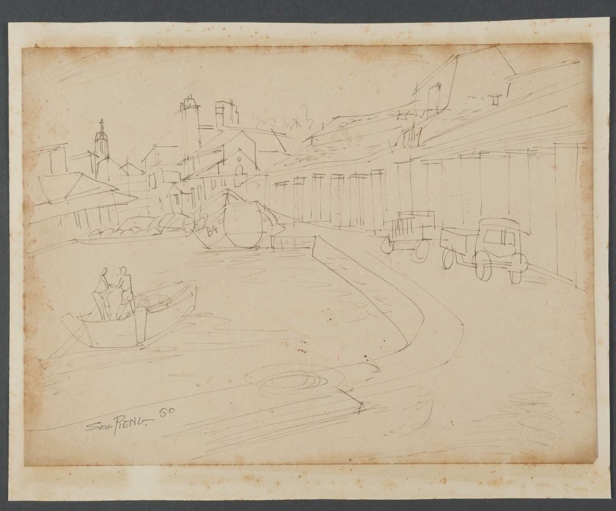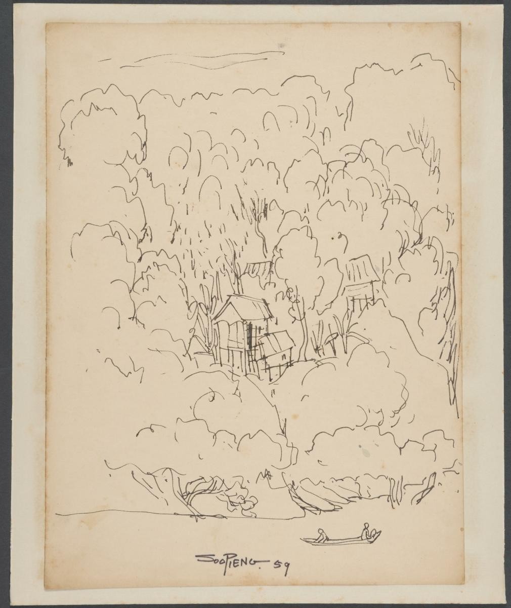 Cheong Soo Pieng, born in Xiamen (Amoy), China in 1914, was accomplished in ink painting having received training in art at Xiamen Academy of Art and Xinhua Academy of Fine Arts in Shanghai. A year after his arrival in Singapore in 1946, he started lecturing at Nanyang Academy of Fine Arts and stayed on till 1961. However it was a trip taken with fellow artists Chen Chong Swee, Chen Wen Hsi and Liu Kang in 1952 to Bali to seek inspiration and seek fresh subject matter that sealed his standing as a pivotal figure in Singapore’s modern art development. He was part of a group of artists that attempted to articulate a style identifiable and pertinent to post-war Singapore, then known collectively with Malaysia, as Malaya. This style, later crystallized as the Nanyang style, provided a foundation upon which future generations of artists learned and expanded on. A key element of the Nanyang style is the synthesis of Chinese pictorial elements and the diverse formalistic qualities from the School of Paris. In 1962, the Singapore government awarded Cheong with the Meritorious Service Medal. He passed away in 1983.‘Untitled (Buildings by the River)’ frames the built environment along a river as a boat chugs pass.