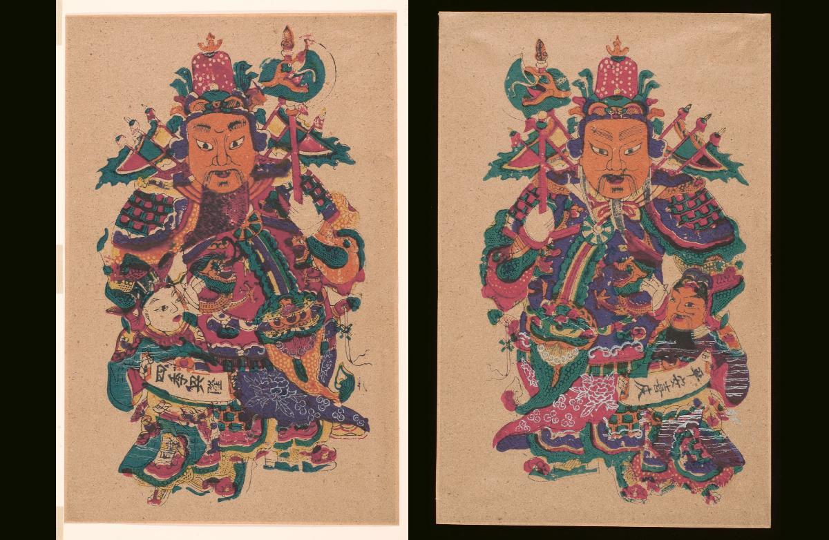 This print depicting a merry scene was produced in Taohuawu, a village in Suzhou province famous for its new year prints, characterised by vibrant colour schemes. Woodblock prints were in mass production across China until the Cultural Revolution. Traditional woodblock prints which depict images of gods or auspicious themes were deemed as objects of superstition and had to be destroyed with their printing moulds. Only propaganda prints designed by the authorities that depicted communist ideologies were printed and circulated.