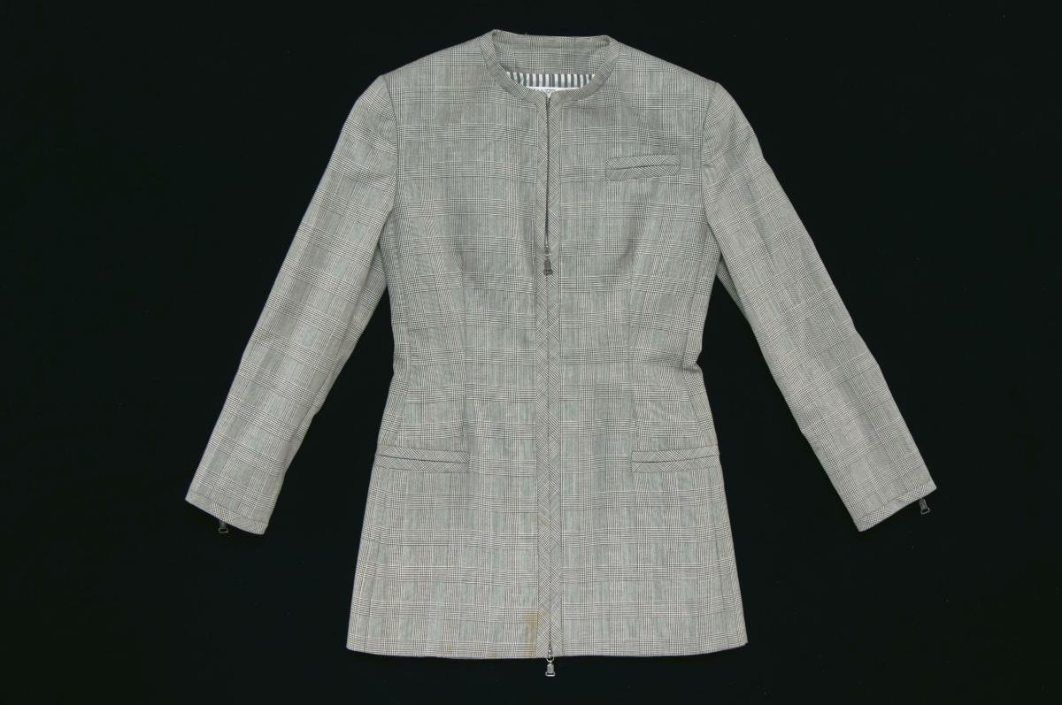 This Gianfranco Ferre black jacket is fitted at the waist and has front and back zip details. Designer labels became popular amongst the increasingly affluent middle and working class women in Singapore, especially from the 1980s onwards. As more women climbed the corporate ladder, their purchasing power increased and the clothes they wore reflected their increasing wealth and changing status. They bought these garments from retailers such as Glamourette, which brought in designer labels.