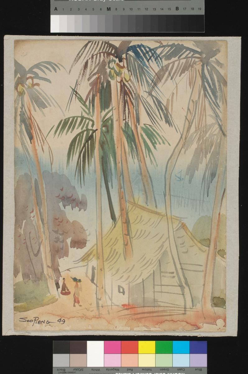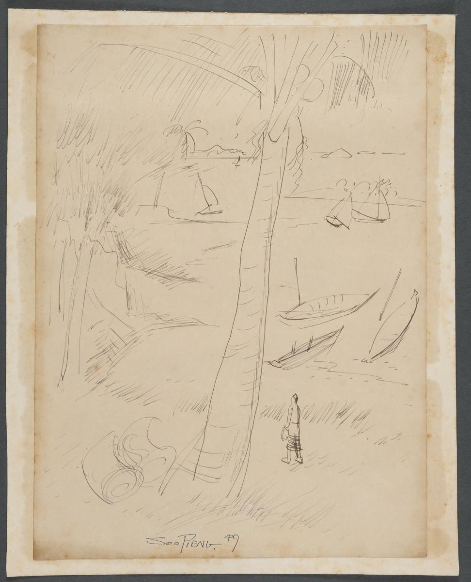 Cheong Soo Pieng, born in Xiamen (Amoy), China in 1914, was accomplished in ink painting having received training in art at Xiamen Academy of Art and Xinhua Academy of Fine Arts in Shanghai. A year after his arrival in Singapore in 1946, he started lecturing at Nanyang Academy of Fine Arts and stayed on till 1961. However it was a trip taken with fellow artists Chen Chong Swee, Chen Wen Hsi and Liu Kang in 1952 to Bali to seek inspiration and seek fresh subject matter that sealed his standing as a pivotal figure in Singapore’s modern art development. He was part of a group of artists that attempted to articulate a style identifiable and pertinent to post-war Singapore, then known collectively with Malaysia, as Malaya. This style, later crystallized as the Nanyang style, provided a foundation upon which future generations of artists learned and expanded on. A key element of the Nanyang style is the synthesis of Chinese pictorial elements and the diverse formalistic qualities from the School of Paris. In 1962, the Singapore government awarded Cheong with the Meritorious Service Medal. He passed away in 1983.‘Untitled (Coconut Trees by The Bridge)’ is an example of Cheong’s interest in the regional landscape. In this monochromatic watercolour sketch, fluid strokes of nuanced tones convey depth, texture, light and shadow.