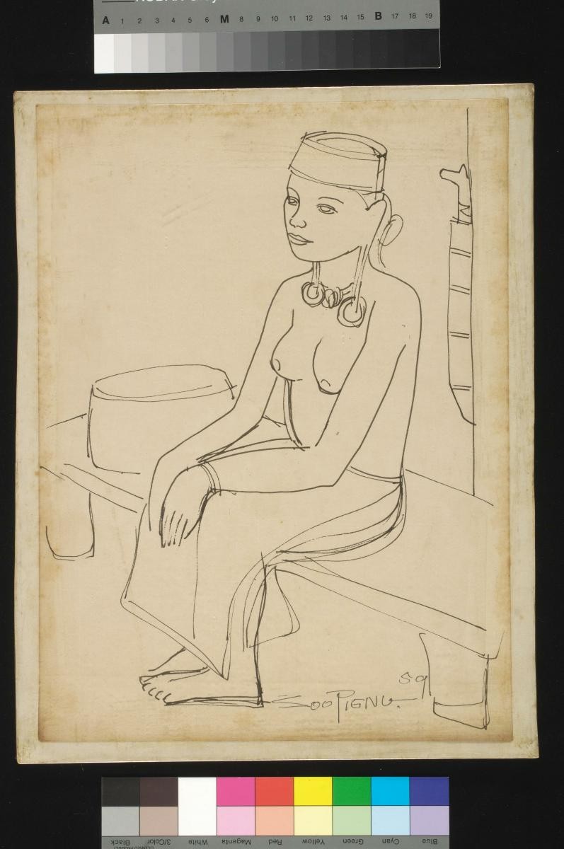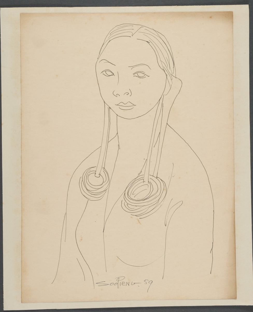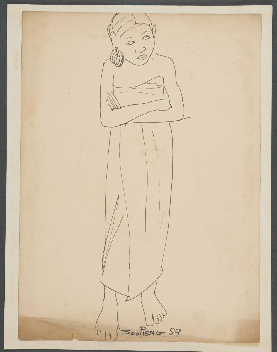 Cheong Soo Pieng, born in Xiamen (Amoy), China in 1914, was accomplished in ink painting having received training in art at Xiamen Academy of Art and Xinhua Academy of Fine Arts in Shanghai. A year after his arrival in Singapore in 1946, he started lecturing at Nanyang Academy of Fine Arts and stayed on till 1961. However it was a trip taken with fellow artists Chen Chong Swee, Chen Wen Hsi and Liu Kang in 1952 to Bali to seek inspiration and seek fresh subject matter that sealed his standing as a pivotal figure in Singapore’s modern art development. He was part of a group of artists that attempted to articulate a style identifiable and pertinent to post-war Singapore, then known collectively with Malaysia, as Malaya. This style, later crystallized as the Nanyang style, provided a foundation upon which future generations of artists learned and expanded on. A key element of the Nanyang style is the synthesis of Chinese pictorial elements and the diverse formalistic qualities from the School of Paris. In 1962, the Singapore government awarded Cheong with the Meritorious Service Medal. He passed away in 1983.‘Untitled (A Standing Dayak Woman)’ is one of many figurative studies of the ethnic group Cheong produced during his trip to Borneo in 1959 that eventually informed his art and iconography.