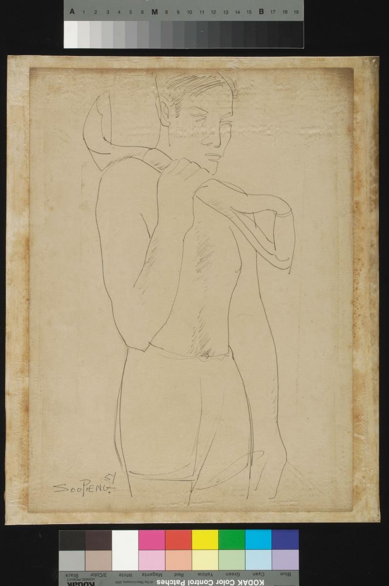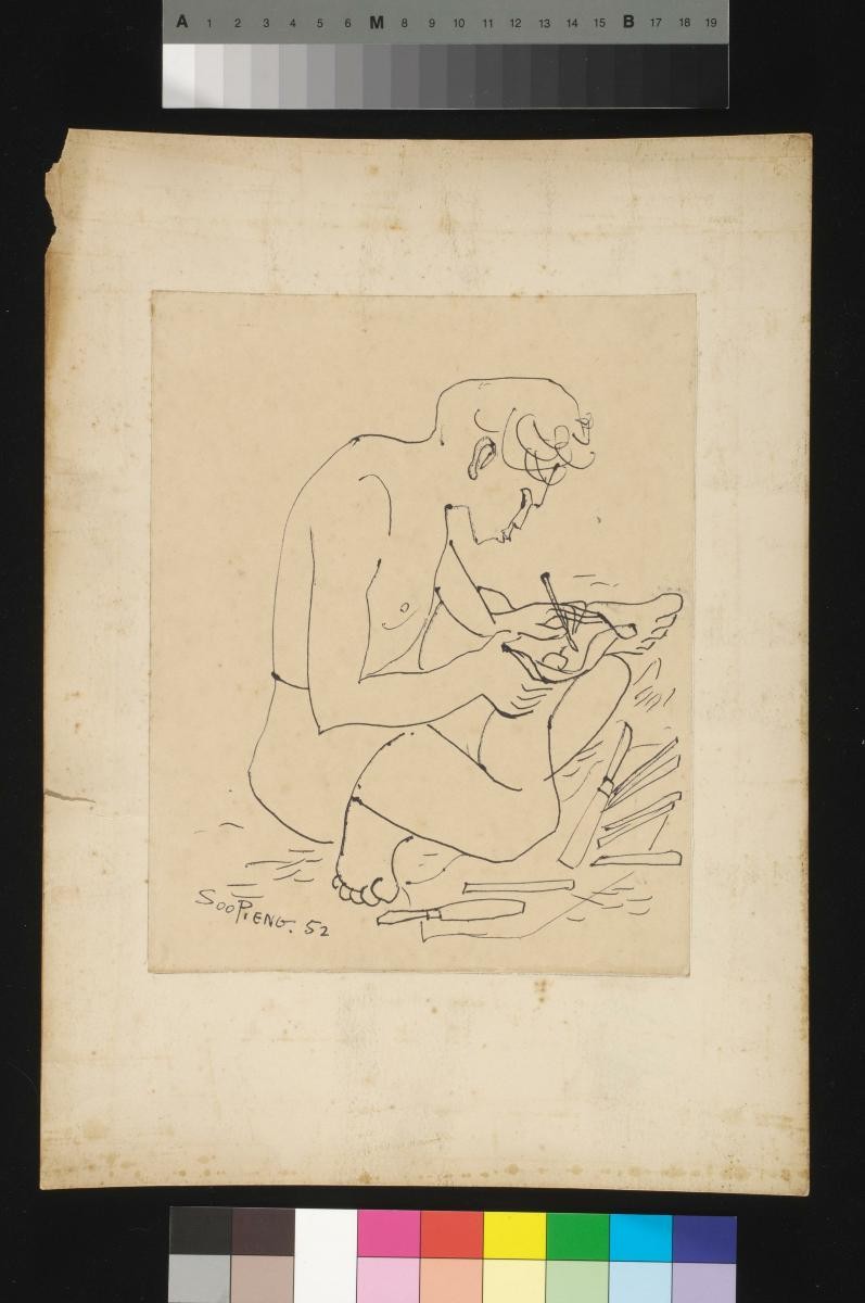 Cheong Soo Pieng, born in Xiamen (Amoy), China in 1914, was accomplished in ink painting having received training in art at Xiamen Academy of Art and Xinhua Academy of Fine Arts in Shanghai. A year after his arrival in Singapore in 1946, he started lecturing at Nanyang Academy of Fine Arts and stayed on till 1961. However it was a trip taken with fellow artists Chen Chong Swee, Chen Wen Hsi and Liu Kang in 1952 to Bali to seek inspiration and seek fresh subject matter that sealed his standing as a pivotal figure in Singapore’s modern art development. He was part of a group of artists that attempted to articulate a style identifiable and pertinent to post-war Singapore, then known collectively with Malaysia, as Malaya. This style, later crystallized as the Nanyang style, provided a foundation upon which future generations of artists learned and expanded on. A key element of the Nanyang style is the synthesis of Chinese pictorial elements and the diverse formalistic qualities from the School of Paris. In 1962, the Singapore government awarded Cheong with the Meritorious Service Medal. He passed away in 1983.A keen observer of people and their activities, Cheong depicts a craftsman hunched over his tools in ‘Untitled (Man Carving with Tools)’.