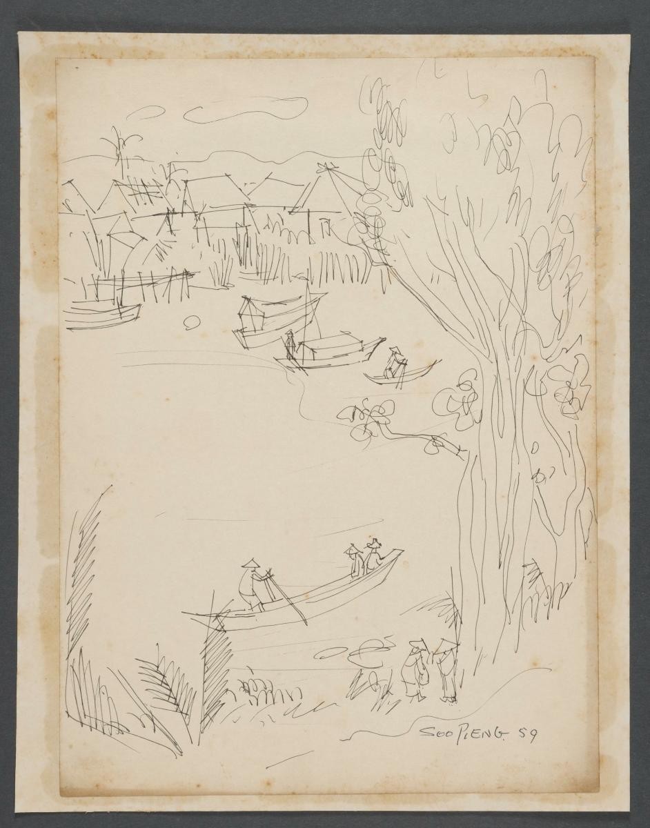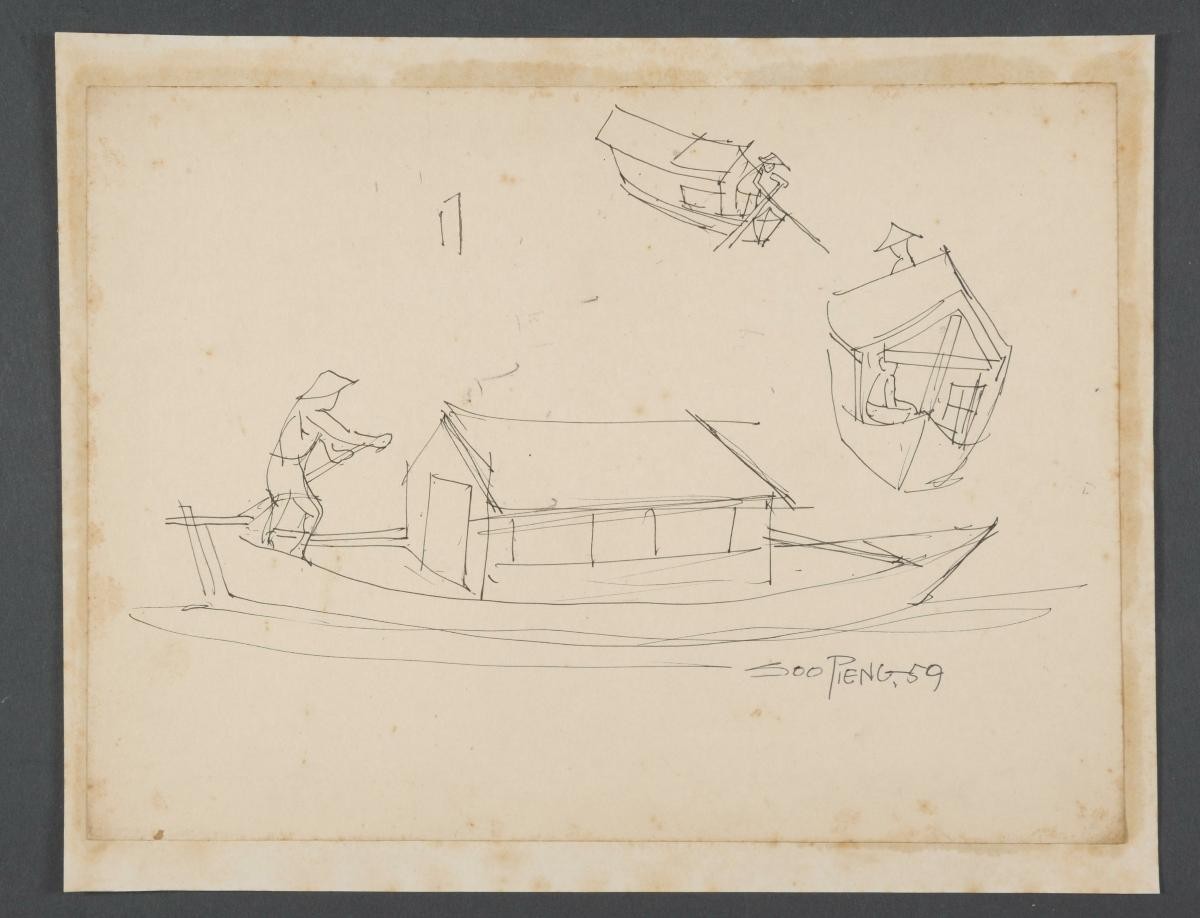 Cheong Soo Pieng, born in Xiamen (Amoy), China in 1914, was accomplished in ink painting having received training in art at Xiamen Academy of Art and Xinhua Academy of Fine Arts in Shanghai. A year after his arrival in Singapore in 1946, he started lecturing at Nanyang Academy of Fine Arts and stayed on till 1961. However it was a trip taken with fellow artists Chen Chong Swee, Chen Wen Hsi and Liu Kang in 1952 to Bali to seek inspiration and seek fresh subject matter that sealed his standing as a pivotal figure in Singapore’s modern art development. He was part of a group of artists that attempted to articulate a style identifiable and pertinent to post-war Singapore, then known collectively with Malaysia, as Malaya. This style, later crystallized as the Nanyang style, provided a foundation upon which future generations of artists learned and expanded on. A key element of the Nanyang style is the synthesis of Chinese pictorial elements and the diverse formalistic qualities from the School of Paris. In 1962, the Singapore government awarded Cheong with the Meritorious Service Medal. He passed away in 1983.‘Untitled (Boatman Working on Sampans)’ is one of countless sketches Cheong produced which reflect the ‘localness of the place’, a theme that resonates throughout his art. Collectively these sketches provide useful entry points to understand the sources of his iconography.
