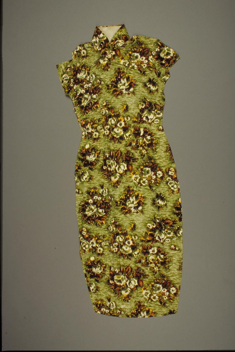 This midnight blue cheongsam with cap sleeves has a nipped in waist which is typical of the 1950s Western silhouette. Such a trend was not only seen in cheongsam, but also in other ethnic costumes such as sari and sarong kebaya.In the 1950s and early 1960s, socialites and film stars such as Lin Dai were often spotted in the latest designs of cheongsam. The cheongsam was at its most stylish and was most commonly worn at functions in Singapore during that time.