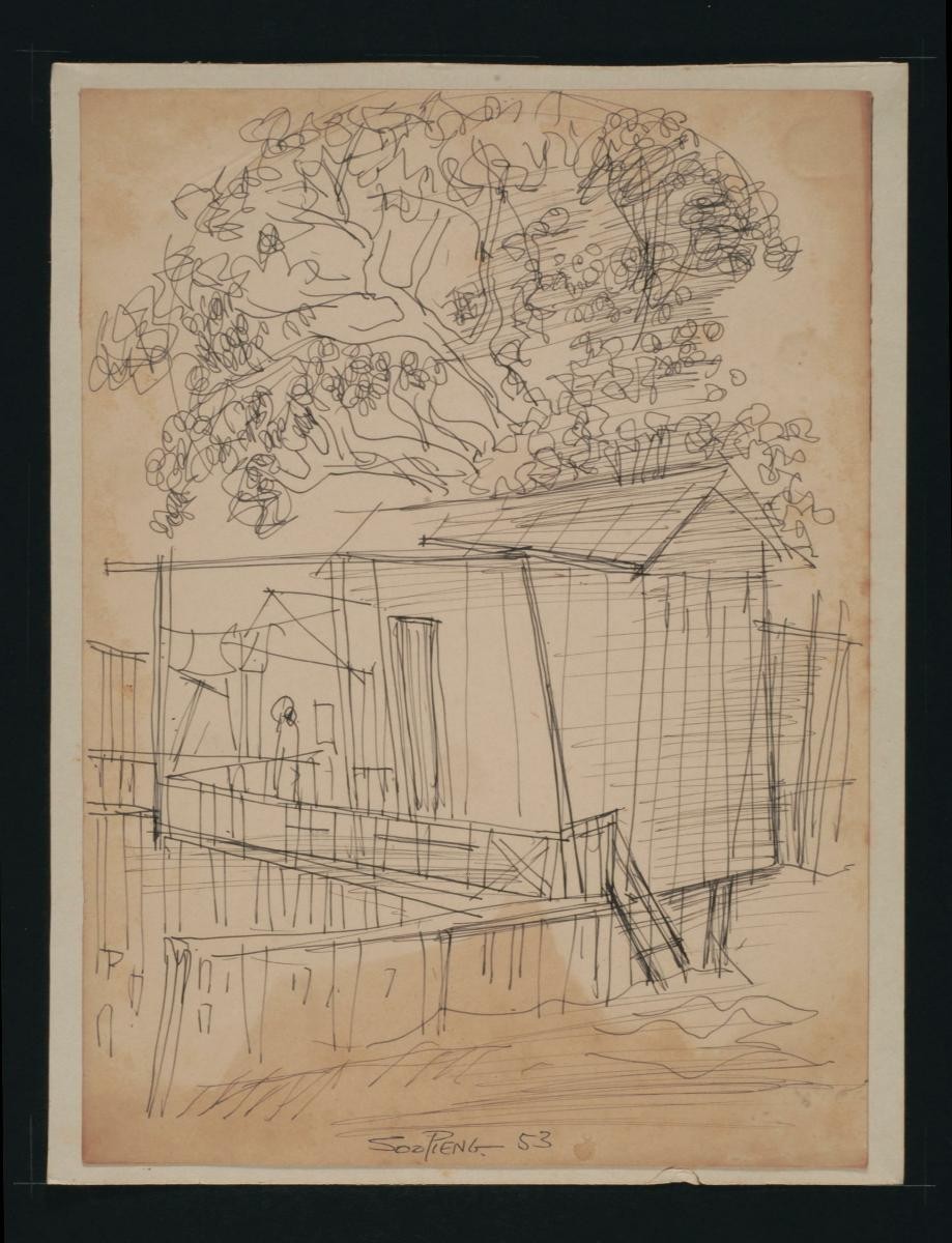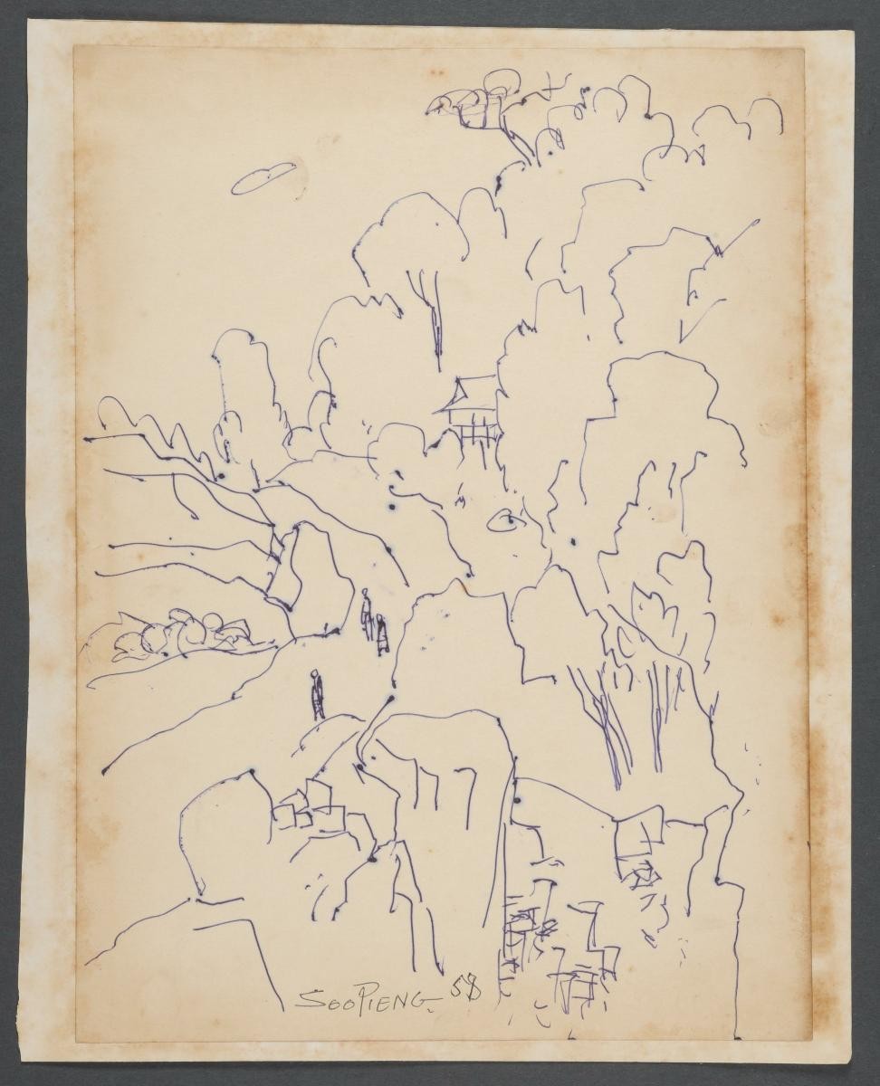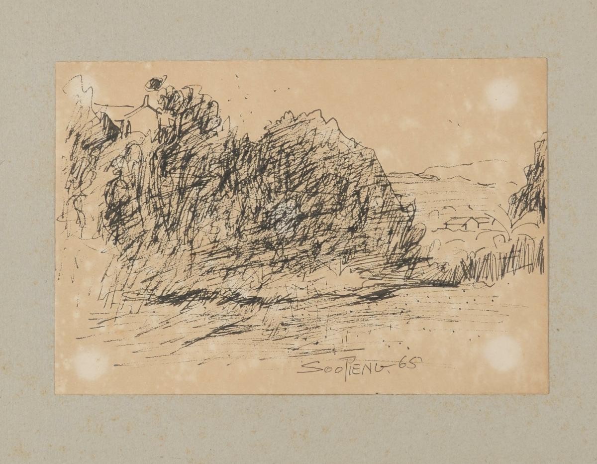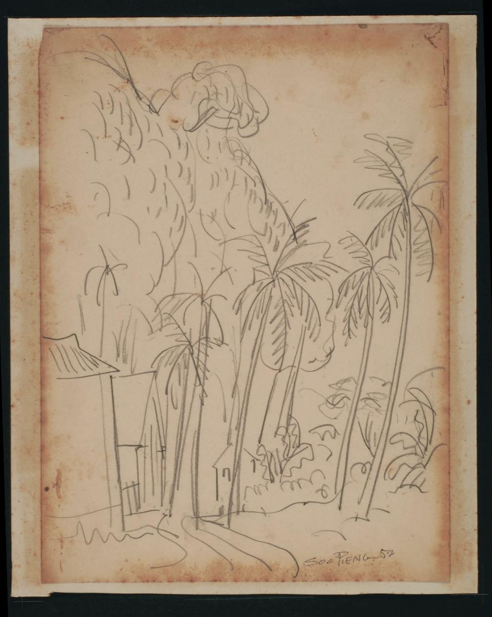 Cheong Soo Pieng, born in Xiamen (Amoy), China in 1914, was accomplished in ink painting having received training in art at Xiamen Academy of Art and Xinhua Academy of Fine Arts in Shanghai. A year after his arrival in Singapore in 1946, he started lecturing at Nanyang Academy of Fine Arts and stayed on till 1961. However it was a trip taken with fellow artists Chen Chong Swee, Chen Wen Hsi and Liu Kang in 1952 to Bali to seek inspiration and seek fresh subject matter that sealed his standing as a pivotal figure in Singapore’s modern art development. He was part of a group of artists that attempted to articulate a style identifiable and pertinent to post-war Singapore, then known collectively with Malaysia, as Malaya. This style, later crystallized as the Nanyang style, provided a foundation upon which future generations of artists learned and expanded on. A key element of the Nanyang style is the synthesis of Chinese pictorial elements and the diverse formalistic qualities from the School of Paris. In 1962, the Singapore government awarded Cheong with the Meritorious Service Medal. He passed away in 1983.A keen observer of the regional landscape, Cheong depicts a typical Malay village house that is often built on stilts and has an attap roof in ‘Untitled (House between Trees)’. He employs an oft-used compositional device of centrally placed trees, in this case the ubiquitous coconut trees, to anchor the drawing.