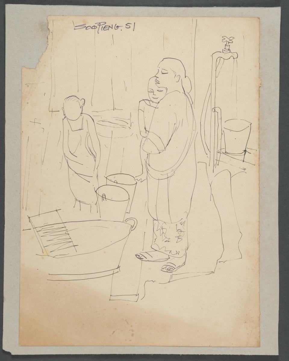 Cheong Soo Pieng, born in Xiamen (Amoy), China in 1914, was accomplished in ink painting having received training in art at Xiamen Academy of Art and Xinhua Academy of Fine Arts in Shanghai. A year after his arrival in Singapore in 1946, he started lecturing at Nanyang Academy of Fine Arts and stayed on till 1961. However it was a trip taken with fellow artists Chen Chong Swee, Chen Wen Hsi and Liu Kang in 1952 to Bali to seek inspiration and seek fresh subject matter that sealed his standing as a pivotal figure in Singapore’s modern art development. He was part of a group of artists that attempted to articulate a style identifiable and pertinent to post-war Singapore, then known collectively with Malaysia, as Malaya. This style, later crystallized as the Nanyang style, provided a foundation upon which future generations of artists learned and expanded on. A key element of the Nanyang style is the synthesis of Chinese pictorial elements and the diverse formalistic qualities from the School of Paris. In 1962, the Singapore government awarded Cheong with the Meritorious Service Medal. He passed away in 1983.‘Untitled (Malay Women Working)’ is one of many sketches Cheong produced of the people of Southeast Asia that provide entry points to understand the sources of his iconography.