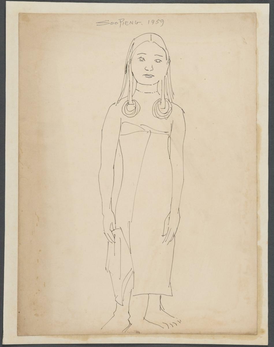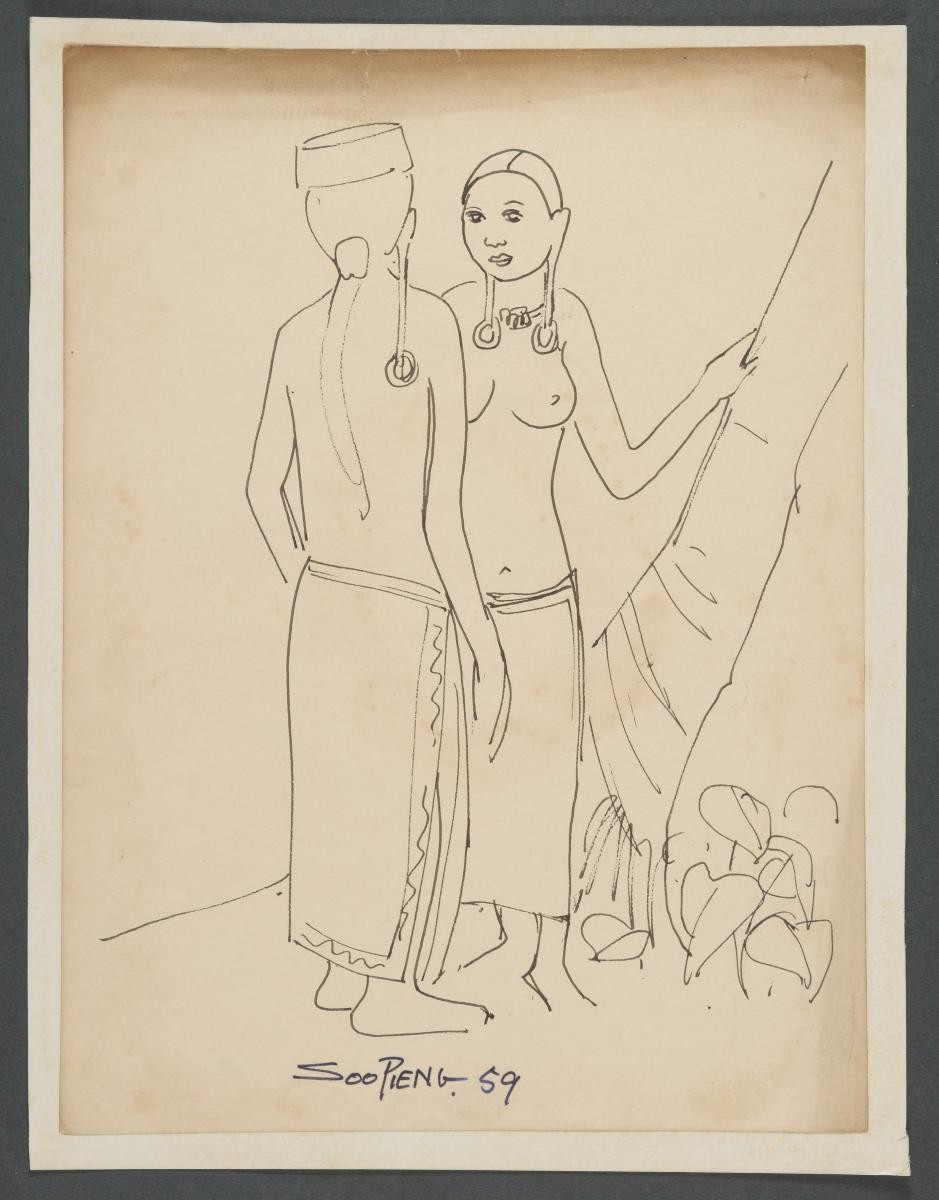 Cheong Soo Pieng, born in Xiamen (Amoy), China in 1914, was accomplished in ink painting having received training in art at Xiamen Academy of Art and Xinhua Academy of Fine Arts in Shanghai. A year after his arrival in Singapore in 1946, he started lecturing at Nanyang Academy of Fine Arts and stayed on till 1961. However it was a trip taken with fellow artists Chen Chong Swee, Chen Wen Hsi and Liu Kang in 1952 to Bali to seek inspiration and seek fresh subject matter that sealed his standing as a pivotal figure in Singapore’s modern art development. He was part of a group of artists that attempted to articulate a style identifiable and pertinent to post-war Singapore, then known collectively with Malaysia, as Malaya. This style, later crystallized as the Nanyang style, provided a foundation upon which future generations of artists learned and expanded on. A key element of the Nanyang style is the synthesis of Chinese pictorial elements and the diverse formalistic qualities from the School of Paris. In 1962, the Singapore government awarded Cheong with the Meritorious Service Medal. He passed away in 1983.‘Untitled (Two Dayak Women Standing by The Tree)’ is one of many figurative studies of the ethnic group Cheong produced during his trip to Borneo in 1959 that eventually informed his art and iconography.