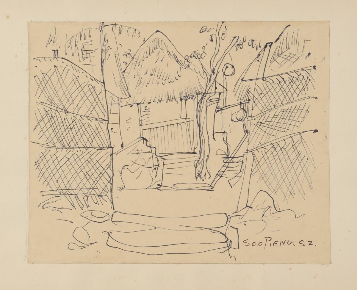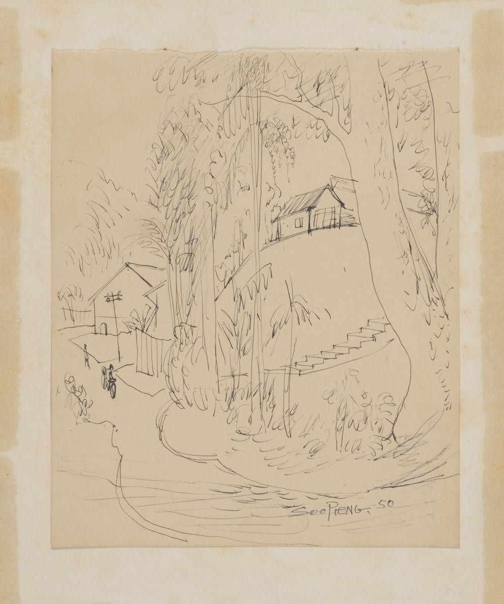 Cheong Soo Pieng, born in Xiamen (Amoy), China in 1914, was accomplished in ink painting having received training in art at Xiamen Academy of Art and Xinhua Academy of Fine Arts in Shanghai. A year after his arrival in Singapore in 1946, he started lecturing at Nanyang Academy of Fine Arts and stayed on till 1961. However it was a trip taken with fellow artists Chen Chong Swee, Chen Wen Hsi and Liu Kang in 1952 to Bali to seek inspiration and seek fresh subject matter that sealed his standing as a pivotal figure in Singapore’s modern art development. He was part of a group of artists that attempted to articulate a style identifiable and pertinent to post-war Singapore, then known collectively with Malaysia, as Malaya. This style, later crystallized as the Nanyang style, provided a foundation upon which future generations of artists learned and expanded on. A key element of the Nanyang style is the synthesis of Chinese pictorial elements and the diverse formalistic qualities from the School of Paris. In 1962, the Singapore government awarded Cheong with the Meritorious Service Medal. He passed away in 1983.'Untitled (Pathway into Village)' is a reflection of the ‘localness of the place’, a theme that resonates strongly in Cheong’s art. This is one of countless sketches he made of the landscape of Southeast Asia which collectively provide useful entry points to understand the sources of his iconography.
