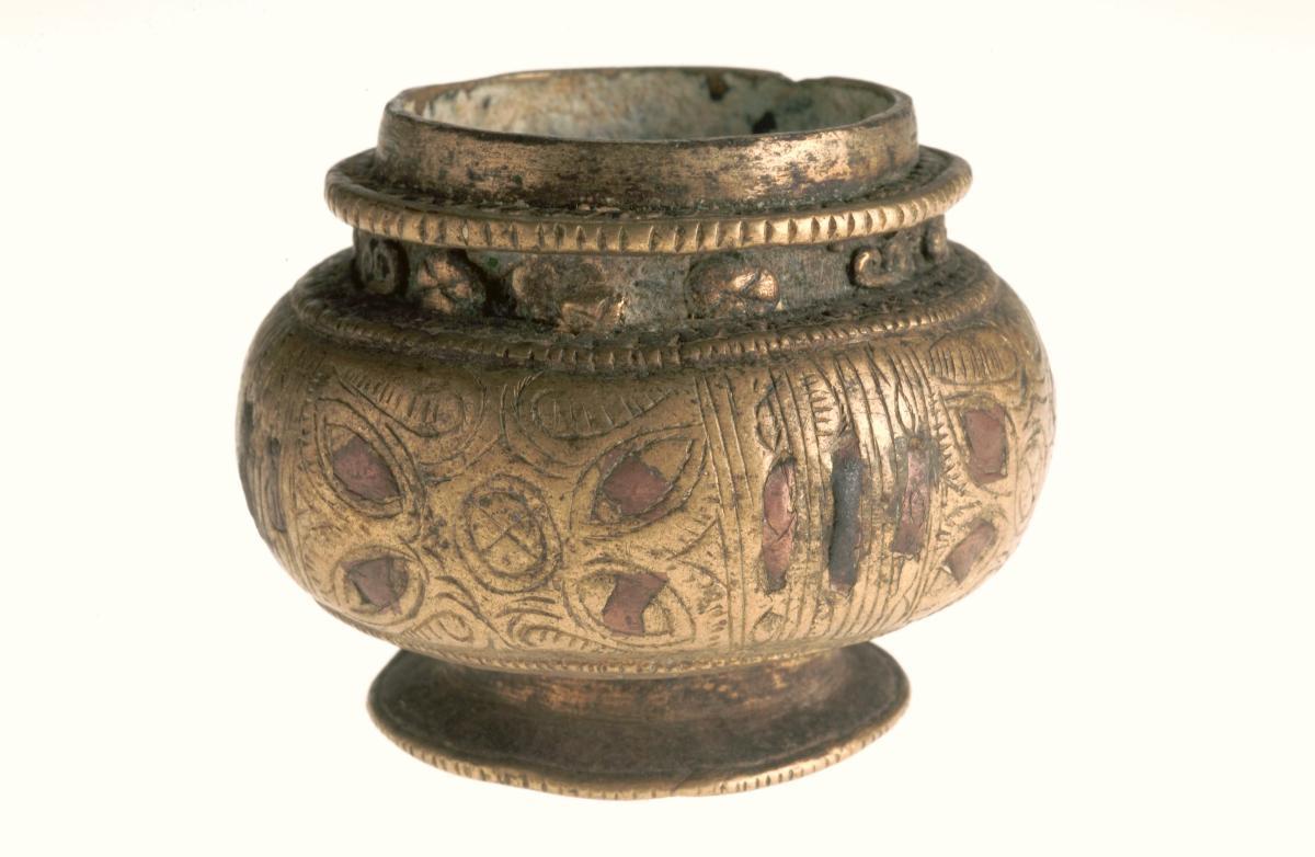 This sireh set features geometric and floral designs known locally as ‘okir’, a very distinctive motif of Maranao woodcarving. The designs were created using silver inlay. This set also features a beaded strap instead of a chain.The brassware of the Southern Philippines is closely related to that cast in other areas of insular Southeast Asia. It is likely that the technique was introduced to the Maranao through close ties with Brunei – a well known area for brassware production. However the inlaying of floral and geometric patterns using silver alloy is unique to Maranao work and makes their brasswares distinctive.