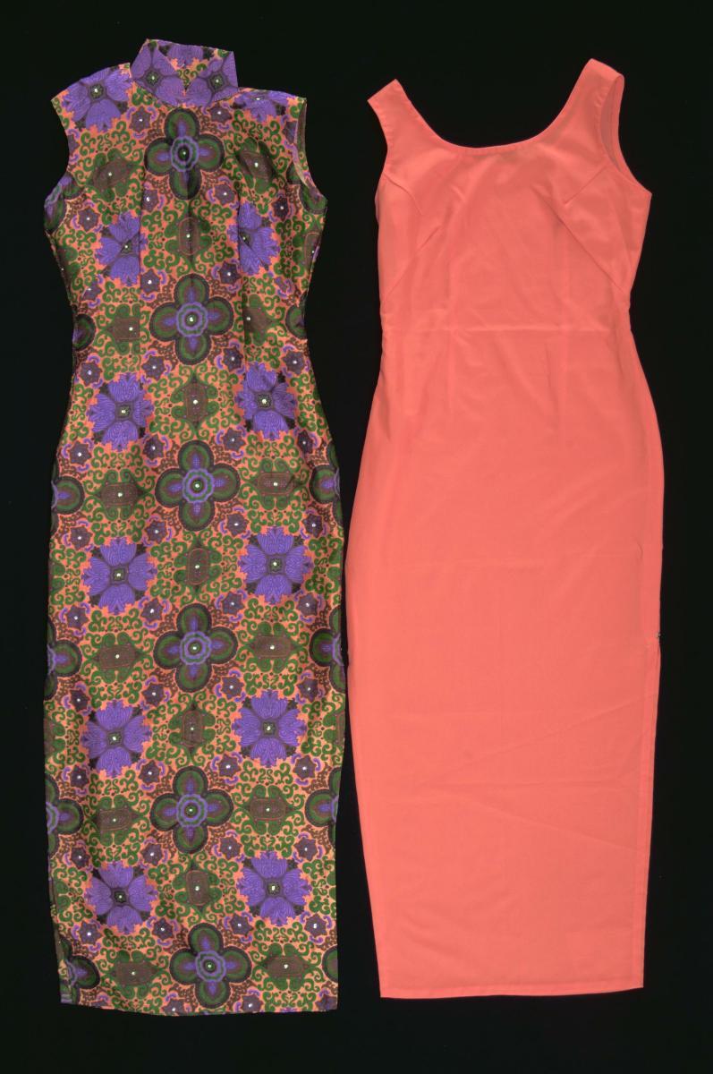This is a black cheongsam decorated with purple floral motifs all over. This knee-length piece is made from polyester, a synthetic fabric that first gained popularity in the 1970s.The cheongsam is a ubiquitous Chinese dress that first gained popularity in the early 20th century and was an essential part of a typical woman’s wardrobe. It has its origins in the originally long robes worn by Manchu women of the Qing Dynasty. The cheongsam is usually bespoked to ensure a fitted silhouette and its other distinctive features include a high collar, side slits at the hem and a decorative knot and loop fastener for the collar or shoulder flap, called the ‘hua niu’.