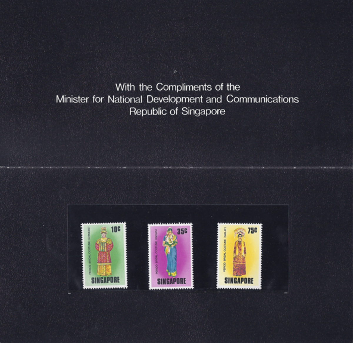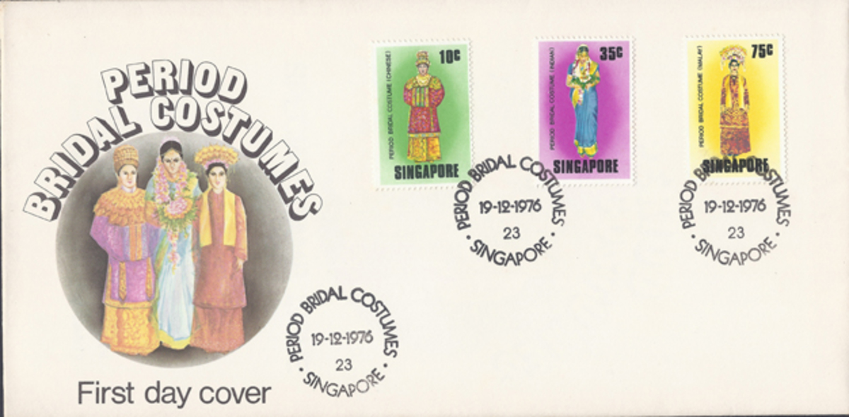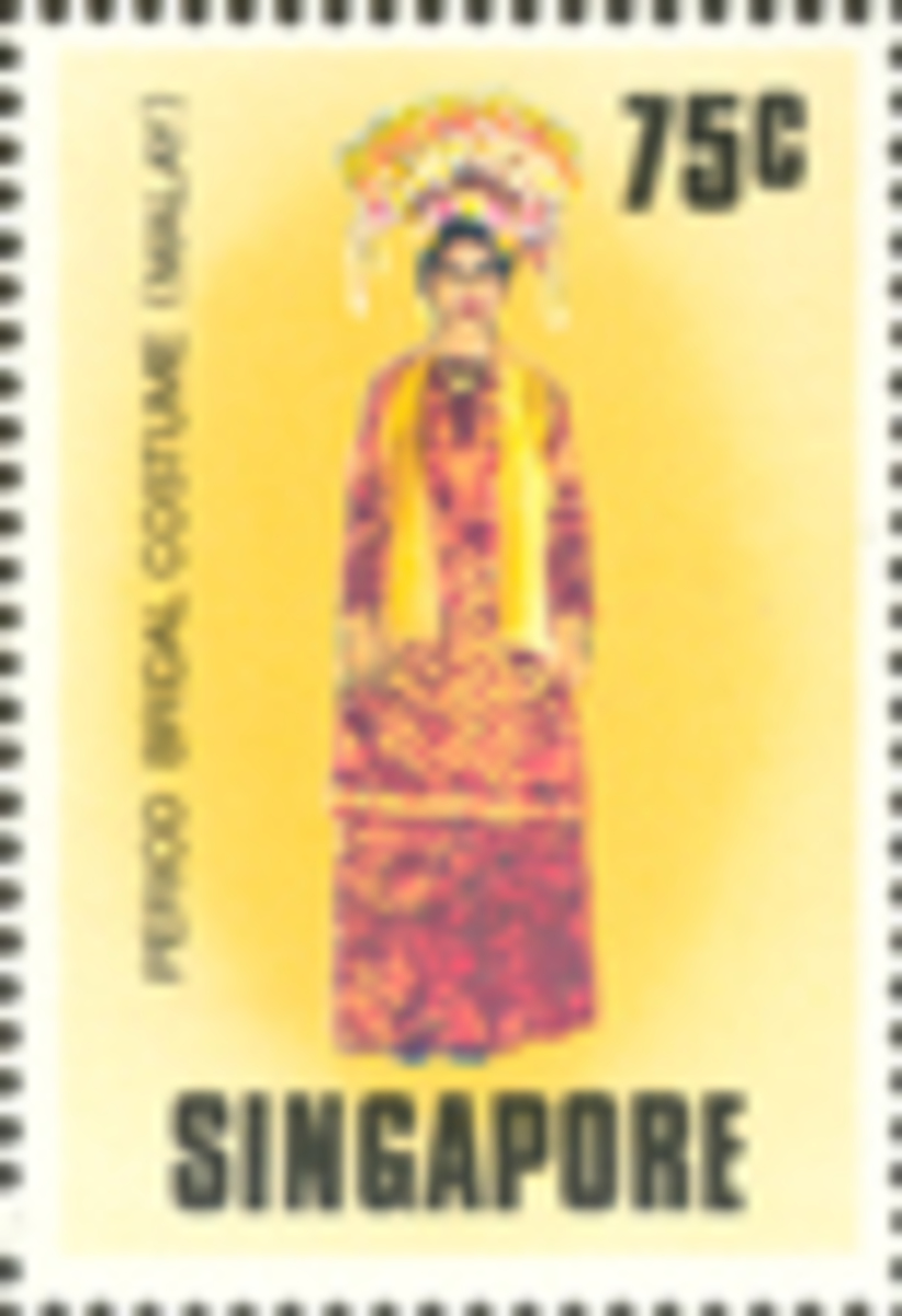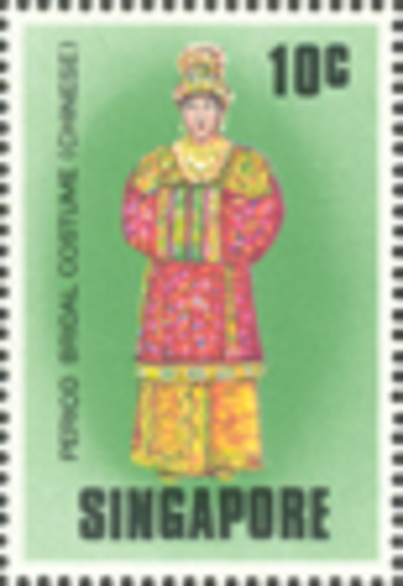 This is an example of a bridal ceremonial costume worn during the traditional 12 day Peranakan Chinese wedding. It is a T-shaped garment with broad, straight sleeves that are broad, heavy and long. It is richly embroidered with auspicious symbols in silk and gold thread couchings. The decorative motifs on the piece include peony flowers, phoenix and pairs of butterflies. Peonies symbolise spring, love, beauty and good fortune while the phoenix can represent beauty, grace, high virtue, the Empress and the bride. In the same vein, butterflies are symbols of joy, beauty, romance and thus associated with weddings. The bride was expected to strike a formal pose which required her to fold her hands in front of her and adjust the ends of the two sleeves in such a way that one slips into the other.