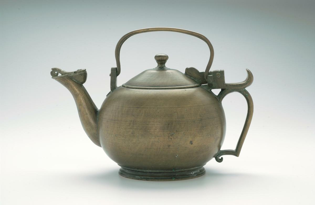 Produced in China for the Thai market, this kettle's yellow background shows that it was most likely made for Buddhist monks. Since King Rama III, Thai kings bestowed gifts like this as a formal recognition of the rank and status of the recipient. Copper was deemed to be particularly suitable for monks given their dedication to a life of poverty.This kettle has a tiered lid that terminates with a finial that resembles a lotus bud. It would have been used in Buddhist ceremonies.