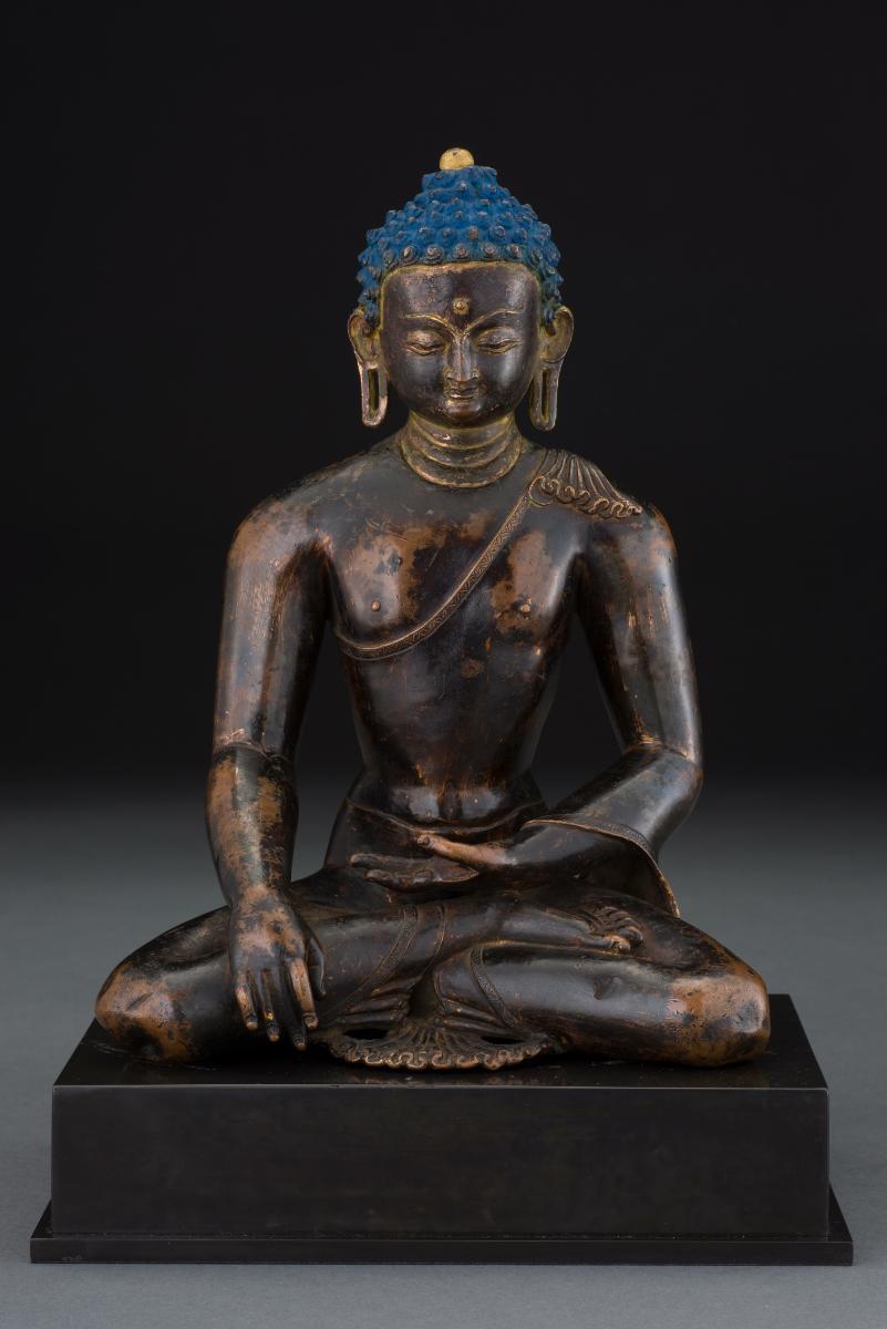 This is a Pala stone relief of a seated Buddha. It epitomises Pala stone sculpture which was usually executed in a fine-grained greyish-black chlorite complete with a highly polished finish. Centres of Pala sculpture included Kurikhara, Bodhgaya, Murshidabad, Muzaffarpur, Rajshahi, Nalanda and Dhakka; this piece is probably from Nalanda. Pala influence extended to Nepal and Tibet and as far as Southeast Asia and China. This stone relief shows the Buddha seated in meditation, a kirtimukha or face of glory at the helm of the arch with curling floral creepers which connect with the foliate tails of the half-bird couple kinnara-kinari on either side of the arch.