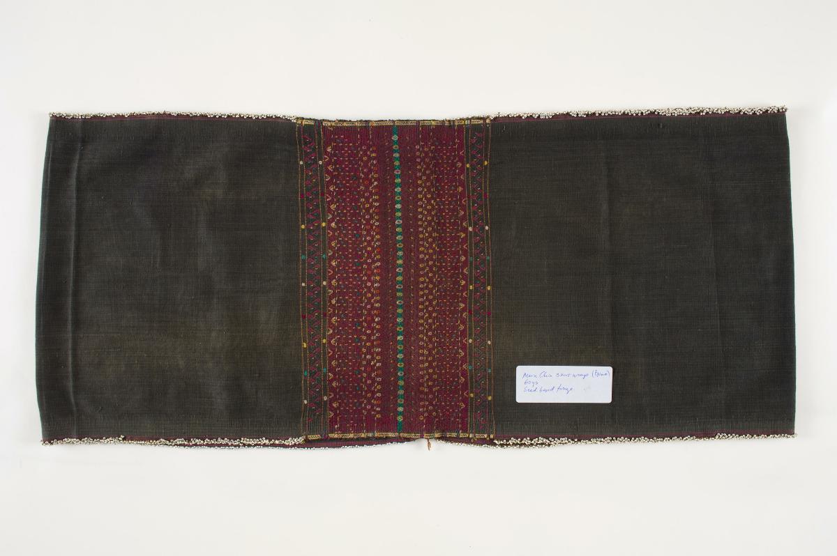 This skirtcloth was woven and worn by an Anu Chin woman. It was made with hand-spun and indigo-dyed cotton, and woven using a backstrap loom. The design comprises simple intersecting bands of supplementary weave using colourful commercially available cotton thread.The hem also has a fringe of cylindrical glass beads. Many different sub-groups of the Chin community live across the hilly Chin state in the north-west region of Myanmar as well as across the border into Chittagong and other areas of north-east India. Their textile arts are a marker of their identity as a sub-group within the wider Chin community. Elaborate textiles also signal the owner's wealth and social standing within the village hierarchy.