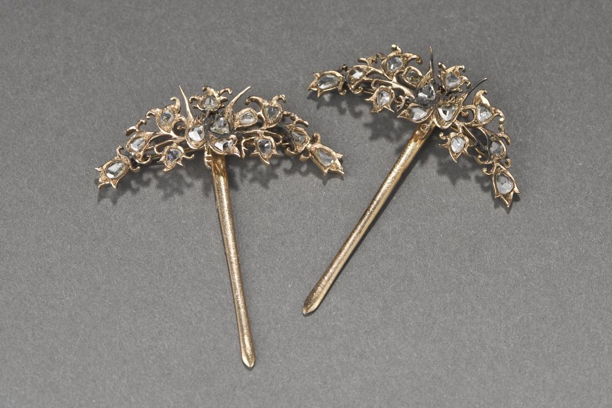 This pair of hairpins is known as flower hairpins or ‘bunga’. They have terminals in the shape of a spatula and the designs are encrusted with turquoise stones. One of this hairpin was usually worn with two other ‘ear digger’ hairpins, otherwise referred to as the coffin nail. These were plain in their design with large rounded knobs at the top. These three hairpins were used to tie a Nonya’s hair up into a tightly coiled bun known as a ‘sanggul’. This was worn high up near the top of the head and was wound very tightly. The two ‘ear digger’ hairpins were worn at an angle to each other with the hair wound around them while the flower hairpin was largely ornamental in purpose. From the 1930s, younger generations of Peranakan women started to crop their long hairs and keep short permed bobs that were fashionable then. Hence, the hairpin style began to go out of fashion.