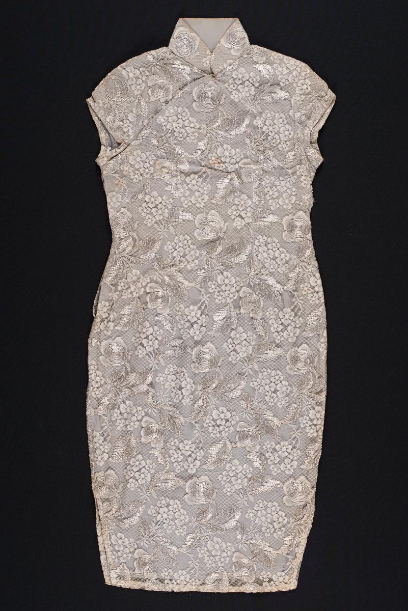 This is a grey cheongsam decorated with light pink floral motifs all over. This calf-length piece is made from cotton, a material that absorbs sweat easily and is thus ideal for wear in Singapore’s tropical climate.The cheongsam is a ubiquitous Chinese dress that first gained popularity in the early 20th century and was an essential part of a typical woman’s wardrobe. It has its origins in the originally long robes worn by Manchu women of the Qing Dynasty. The cheongsam is usually bespoked to ensure a fitted silhouette and its other distinctive features include a high collar, side slits at the hem and a decorative knot and loop fastener for the collar or shoulder flap, called the ‘hua niu’.