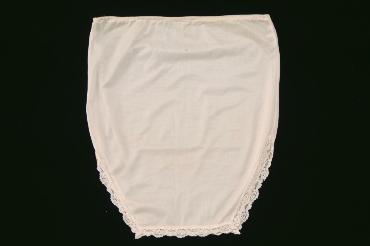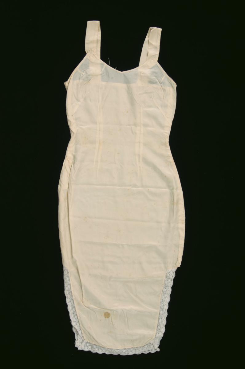 This ivory slip is worn under a cheongsam.The cheongsam is a ubiquitous Chinese dress that first gained popularity in China in the early 20th century. Feted for its feminine charm, the dress was an essential part of women’s everyday wear up till the 1960s. It is usually bespoked to ensure a fitted silhouette and its distinctive features include a high collar, side slits at the hem and a decorative knot and loop fastener for the collar or shoulder flap, called the ‘hua niu’.The cheongsam has its origins in the long and loose-fitting robes worn by the Manchu women of the Qing Dynasty, called the “banner gown” (‘qipao’). Initially worn loose and long in the 1920s and 1930s, the cheongsam had evolved by the 1940s and 1950s to become shorter and more form-fitting. Although its popularity was overtaken by mass-produced, Western-style garments during the 1970s and 1980s, the dress experienced a fashion renaissance in the 1990s when it became the inspiration for some of the runway collections created by various internationally-renowned fashion designers. Today, the cheongsam remains a subject of reinterpretation and its style is constantly being updated.