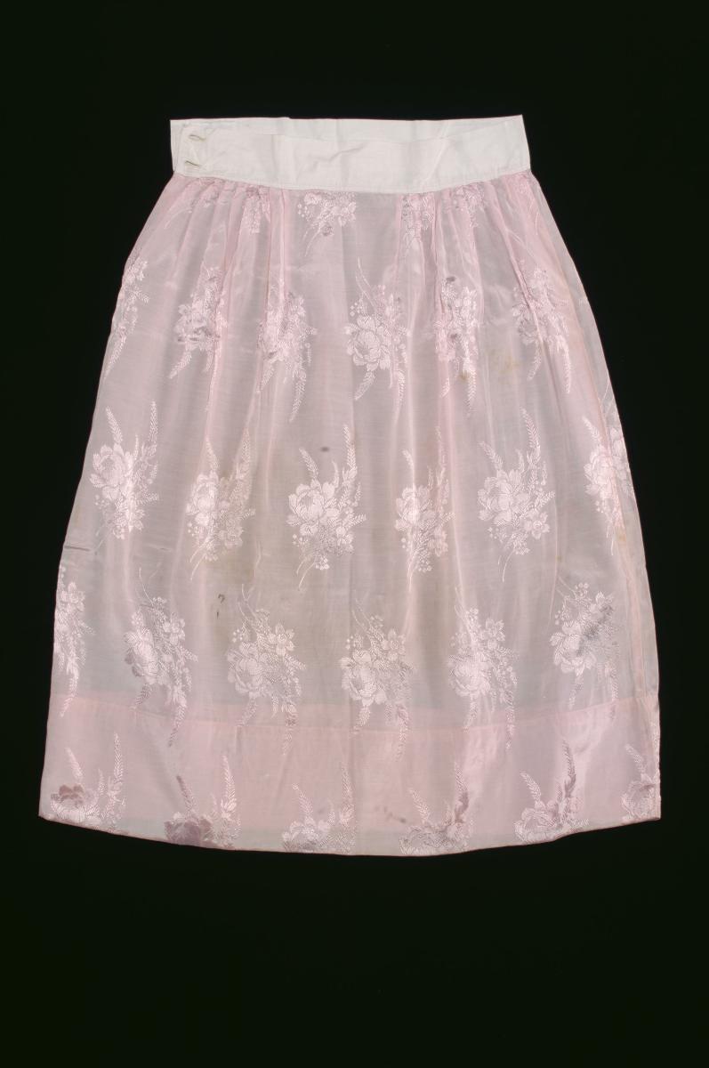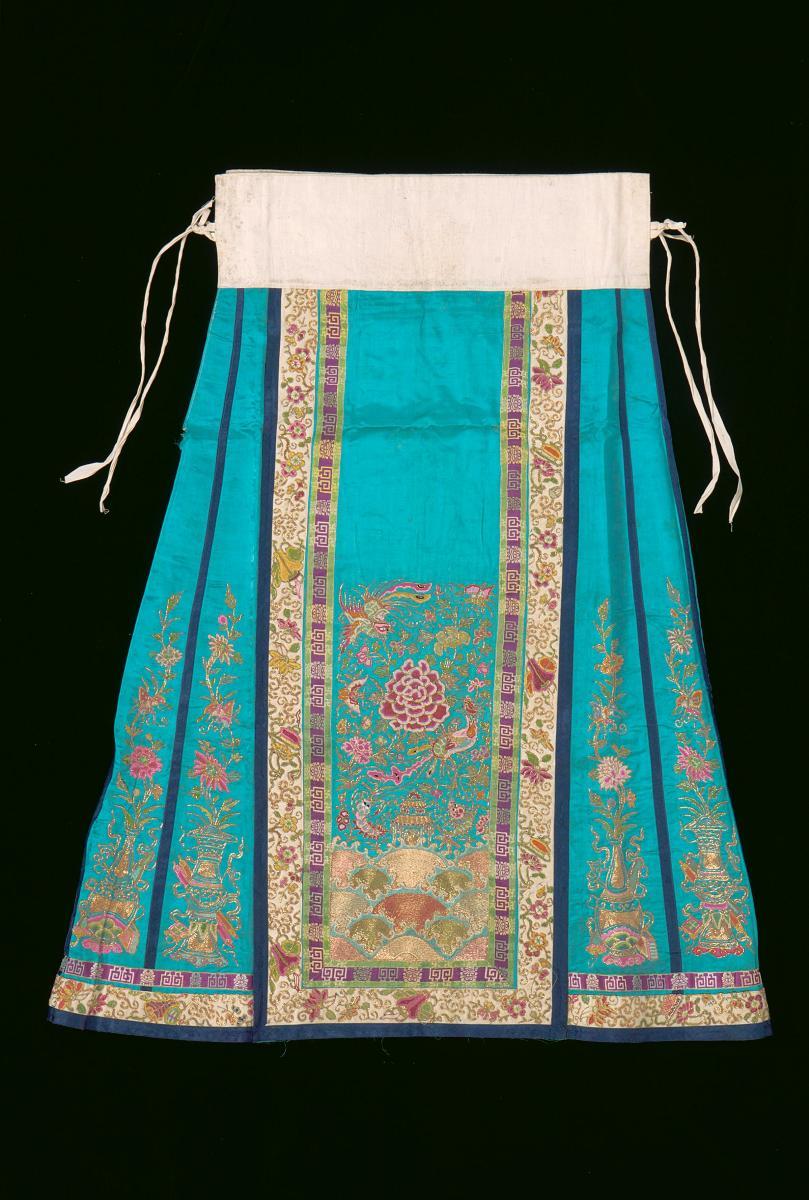 This skirt features various flower and animal motifs embroidered in gold thread.Up to early 20th century, Peranakan Chinese brides wore Chinese garments for their weddings and decorated their wedding beds with Chinese embroideries and beadwork. Such garments and bed textiles were typically decorated with auspicious Chinese motifs like phoenixes, dragons, and peonies embroidered in gold thread.Indonesian Peranakan wedding costumes tended to be more extravagant than the ones used in Singapore, Malacca and Penang. The costumes in Indonesia were often sewed with pure silver and gold threads with some having sequins of pure gold and set with rough cut diamonds.