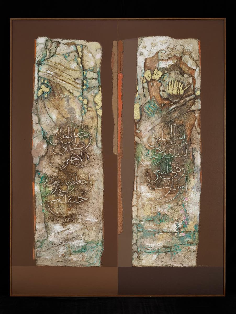 In his search for an alternative paradigm to Western centric art making, Esa calls on the need for awareness of Eastern art and to progress by going back to one’s tradition. The clash of Western art (exemplified by the naked human figure which is a forbidden type of representation in Islamic) and decorative patterns from Islamic art is a metaphor for the internal artistic struggle that Esa was experiencing.The existential angst over what should be the artist’s course of action is indicated by the title of the series, Waiting for Godot. It refers to the titular absurdist play by Samuel Beckett in which two characters, Vladimir and Estragon, wait endlessly and in vain for someone named Godot to arrive.
