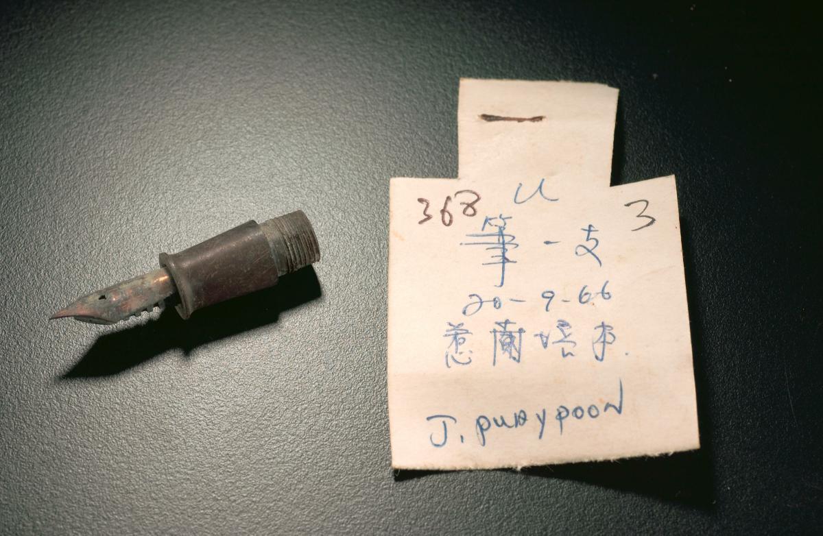 This nib is the fragment of a fountain pen that belonged to a victim of the Japanese Occupation. It was excavated from a site at Jalan Pui Poon in 1966.