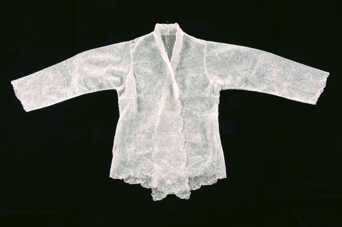 This kebaya renda is made from white translucent voile and decorated with lace, which is sewn onto the edges of the plain fabric. Such forms of kebayas were commonly worn from the 1920s onwards among Nyonyas in the Straits Settlements. Eurasian women in the Dutch East Indies wore similar white cotton kebayas trimmed with handmade European lace in the day.The Peranakan Chinese kebaya is a long sleeved, open blouse reaching to about waist-length. It is usually decorated with embroidery and lace on the frontal and outer hems, as well as the fringes of the sleeves. The garment has a v-shaped neckline and an open front, which is secured by three ‘kerosangs’ or brooches. A kebaya could be made from rubia or voile, which is a type of fine cotton fabric originating from France or Switzerland. Peranakans generally wore kebayas with geometric or floral designs in the 20th century and coloured kebayas became fashionable during this time. The kebaya came into prominence in the early 20th century, when it slowly replaced the knee length ‘baju panjang’ robe. It is worn with an inner camisole and paired with the sarong, which is a rectangular piece of dyed cotton cloth worn as a skirt by wrapping it around the waist. These garments became a distinct part of the identity of Peranakan women.