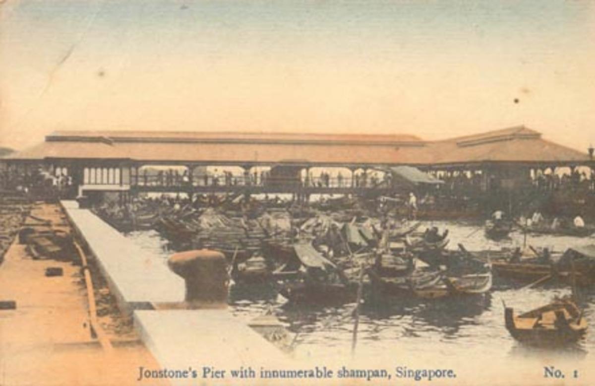 Chinesische Passaglere am Pier. Singapore.