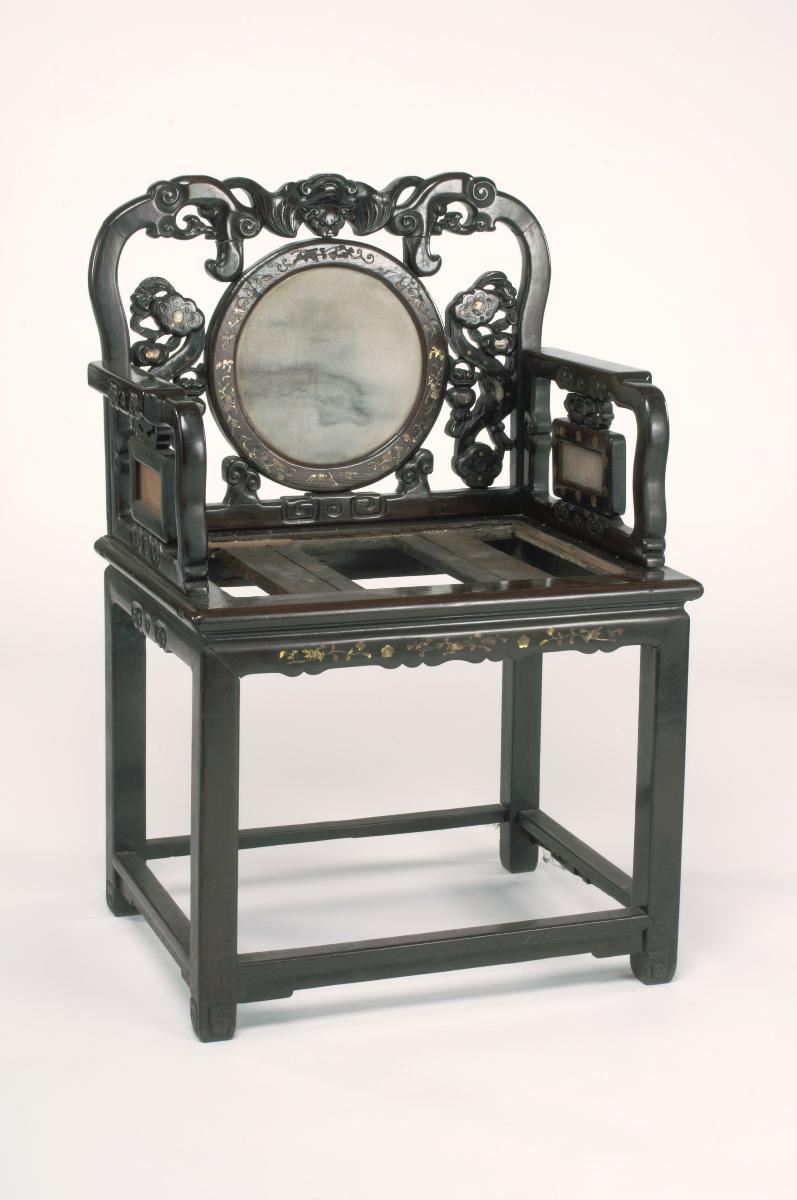 This set of eight chairs and three side tea tables belonged to the Cantonese Rattan Industry Association. They are an example of the standard hardwood furniture used for traditional Chinese clan association hall settings during the late 19th to early 20th century.