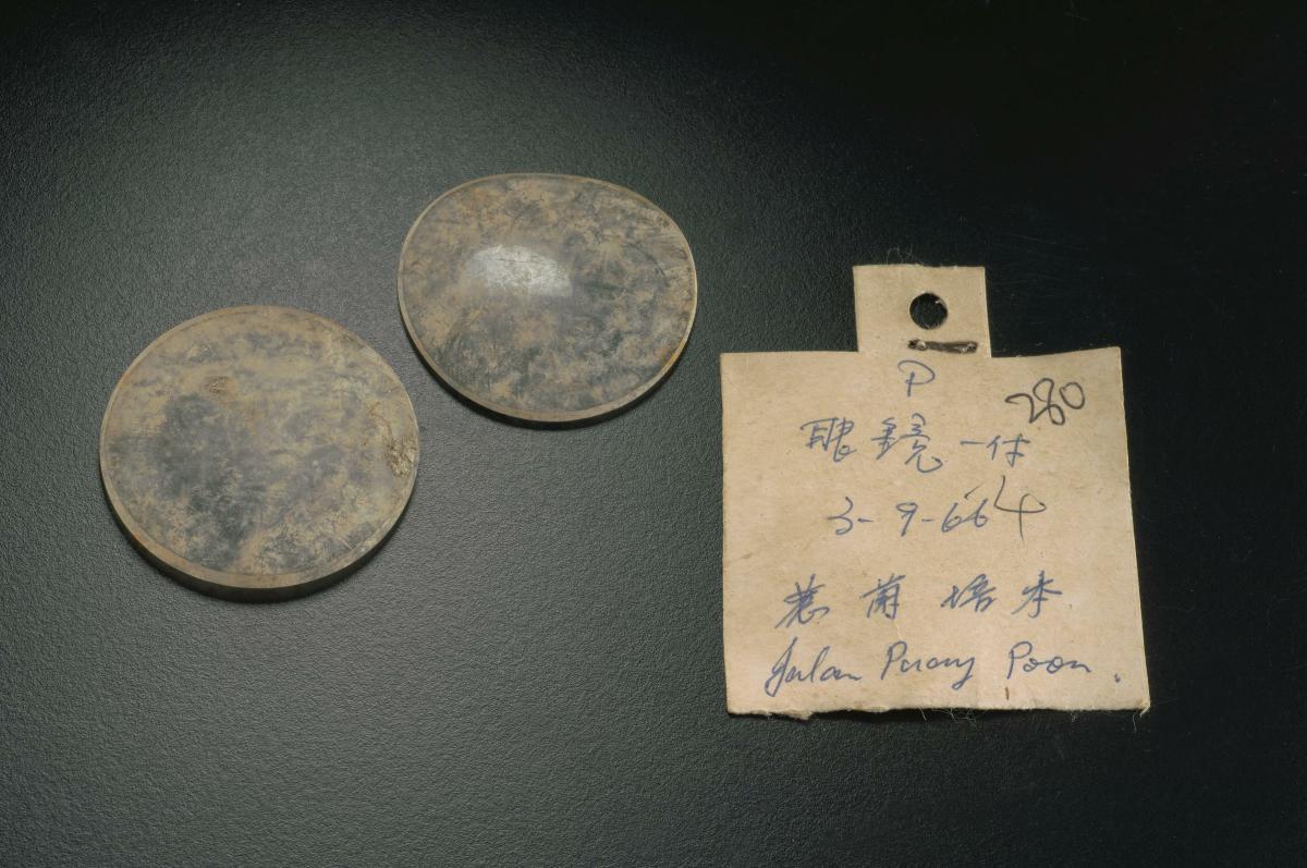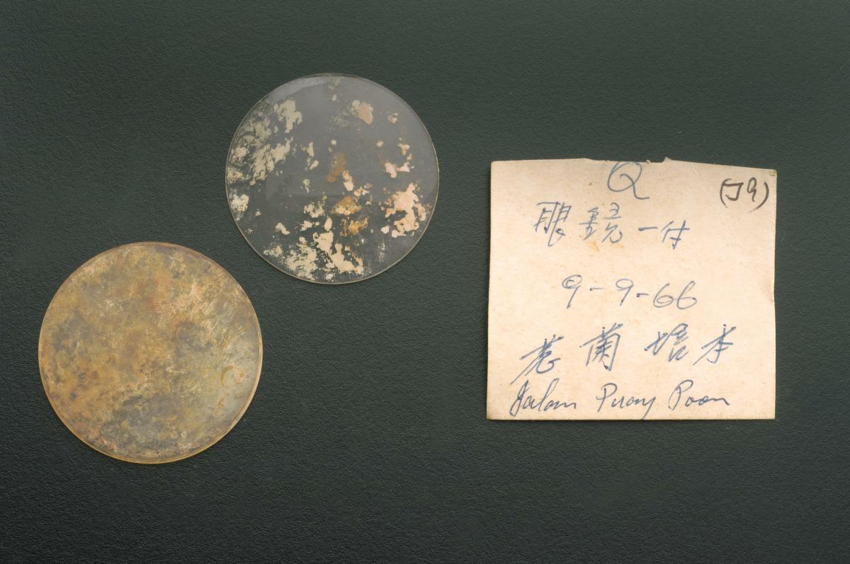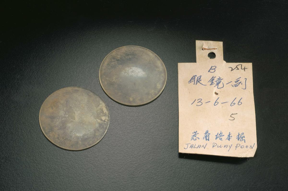 These glass lenses are the fragments of a pair of spectacles worn by a victim of the Japanese Occupation. They were excavated from a site at Jalan Pui Poon in 1966.