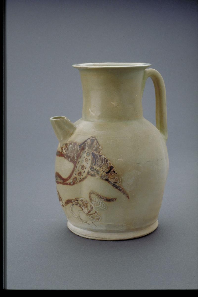 This elegant ewer is constructed almost entirely of delicate mother-of-pearl plates secured together by small iron pins. The form rises from a pedestal foot and has a curved spout and mounted scroll-shaped handle. The plates form inner and outer walls that are directly attached to each other, the shape reinforced by a series of interior metal bands. This construction required great skill and specialized techniques were needed to cut and polish the mother-of-pearl to retain the iridescent sheen of the material.Article like this were made in Gujarat in the late 16th and early 17th centuries for domestic consumption and for export to the Middle East and Europe, where they were prized as magnificent display pieces. They are particularly associated with the Portuguese, whose trading empire brought an unprecedented flow of exotic goods from Asia to Europe. This ewer was previously in the collection of Lord Curzon of Kedelston, the Viceroy of India, 1899-1905.