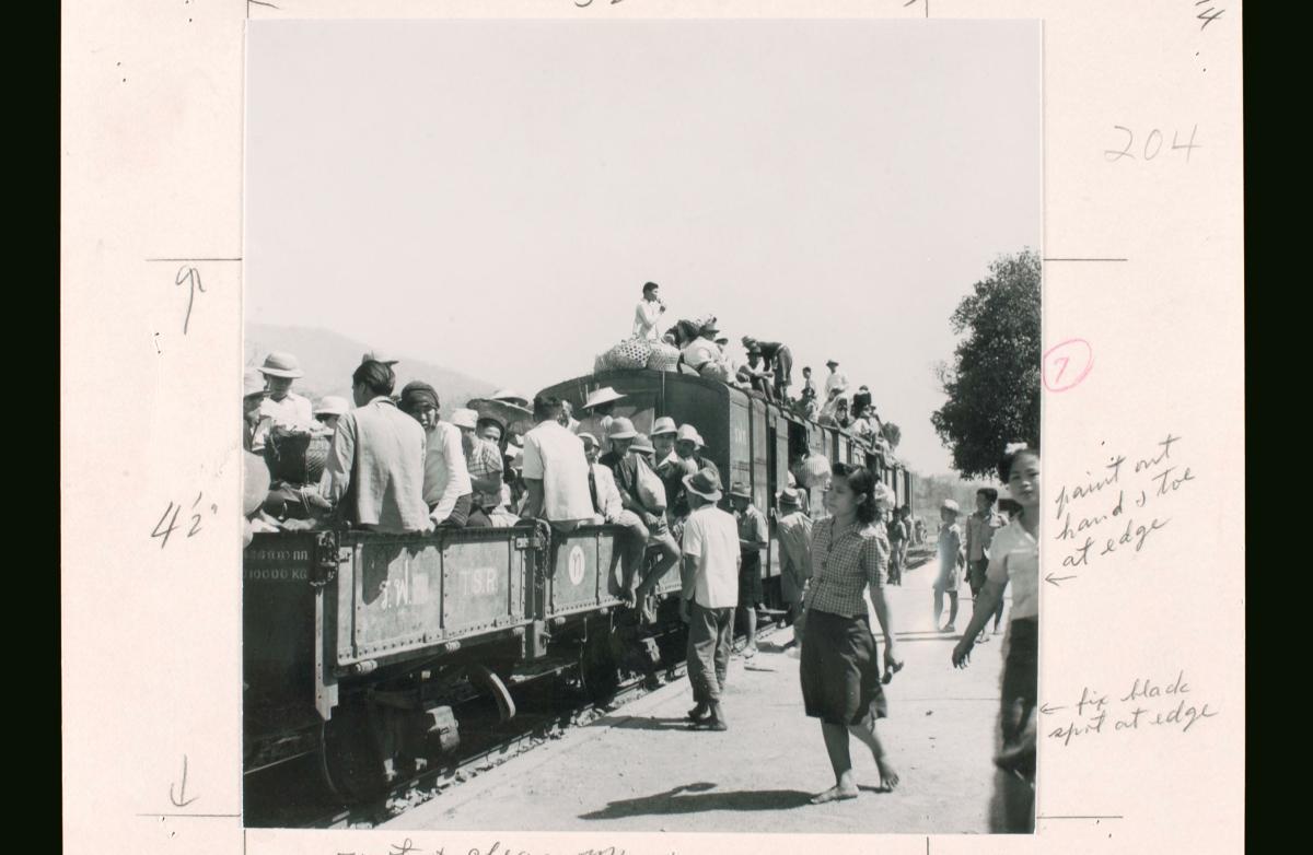 This photograph is part of a set acquired from the National Geographic Society, a non-profit scientific and educational institution. The photographs depict the sights and scenes of Singapore, Malaysia, Thailand, and Indonesia. This particular photograph shows a train in Sumatra, Indonesia.