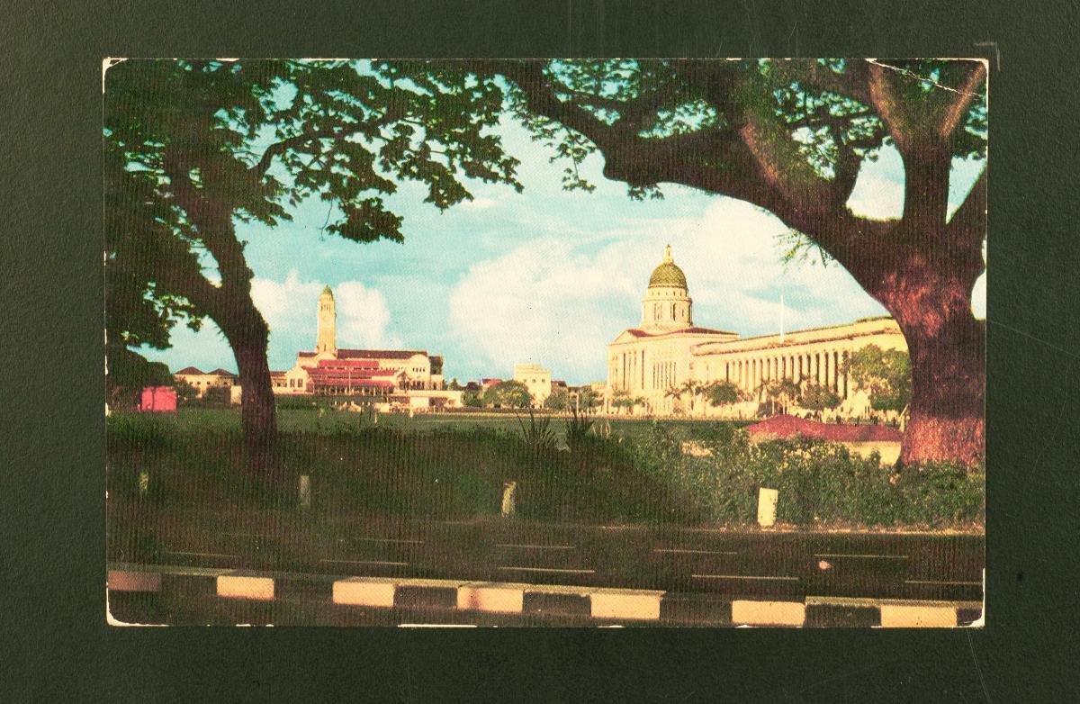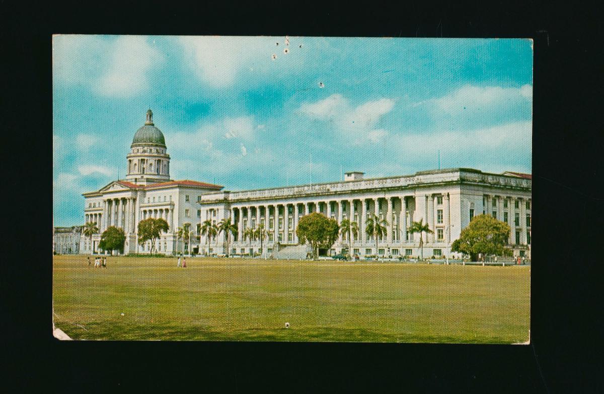 This photograph is part of a series which depicts the sights and scenes of 19th and 20th century Singapore.The Supreme Court was opened on 3 August 1939 by Sir Shenton Thomas, Governor of the Straits Settlements. The Corinthian and Ionic columns as well as the sculptures were created by Calvalieri Rudolfo Nolli. Its architecture was intended to complement the Municipal Building located next to it. The Municipal Building was built between 1926 and 1929. In 1951, the building name was changed to City Hall.