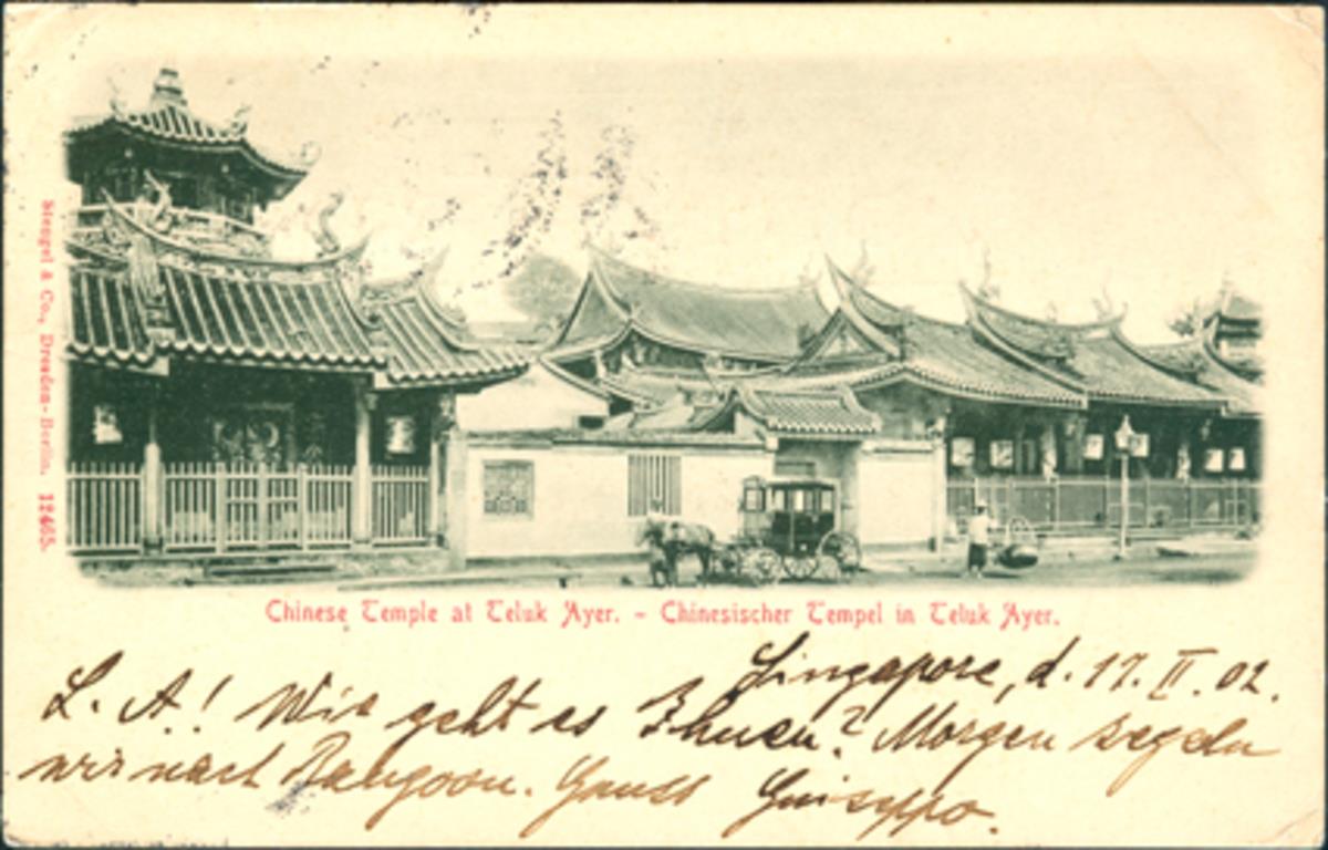 This postcard is part of a set acquired by the museum. The collection provides a glimpse into the physical and social landscape of Singapore during the 19th and 20th century which were characterised by European colonialism, the Japanese Occupation, and the post-war years. These postcards also give a glimpse into the type of architecture that was seen in Singapore in those days, as well as the range of activities, businesses, trades, and industries that the people of Singapore were involved in at that time. Some of these postcards still contain the original handwriting of the senders themselves.Telok Ayer (or ‘water bay’ in Malay) Street was the main commercial and residential area for early Chinese immigrants in Singapore. The Thian Hock Keng Temple, dedicated to the Goddess of the Sea, and the Chong Wen Ge, the first educational institution set up by the Chinese community in Singapore, can be seen in the postcard.