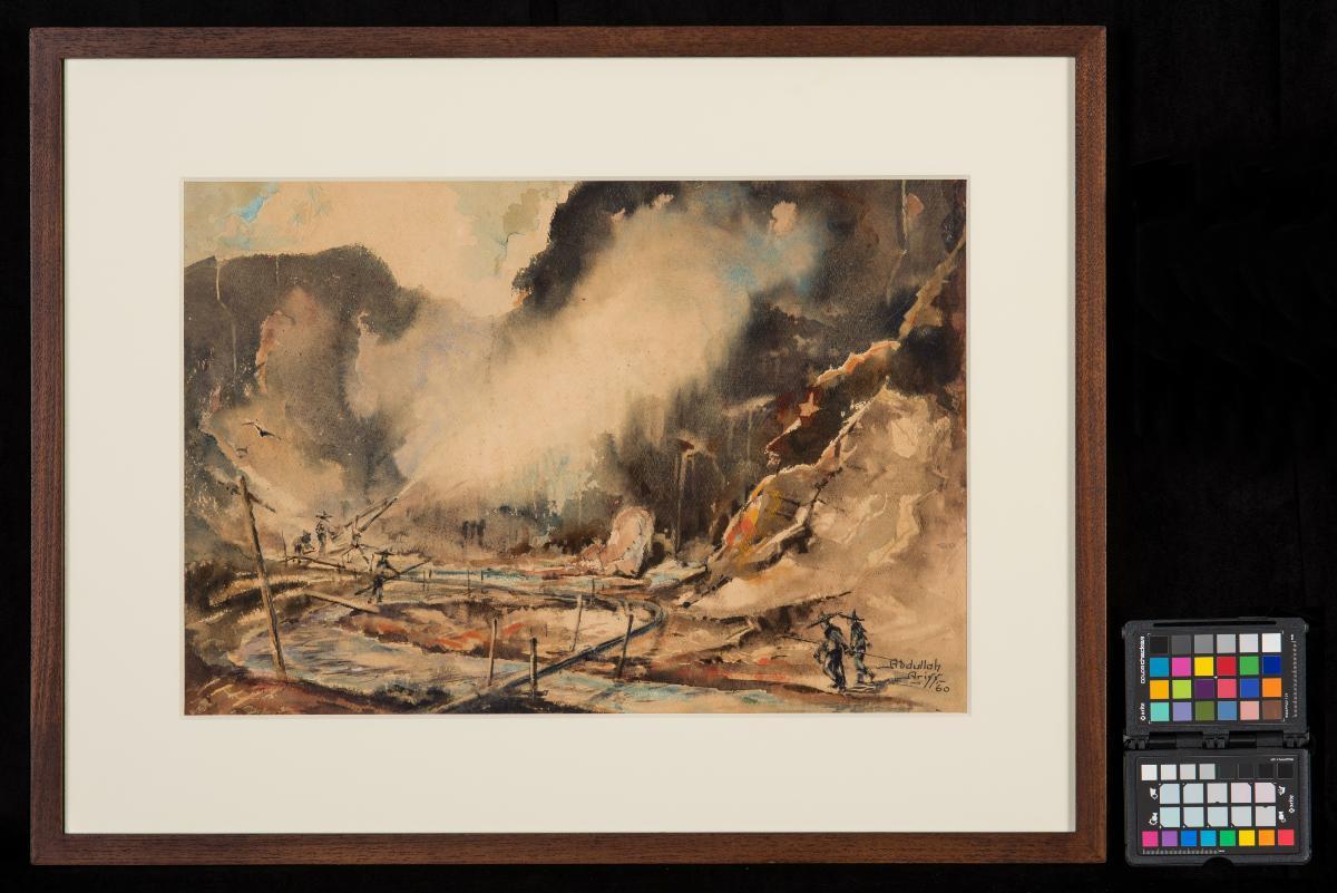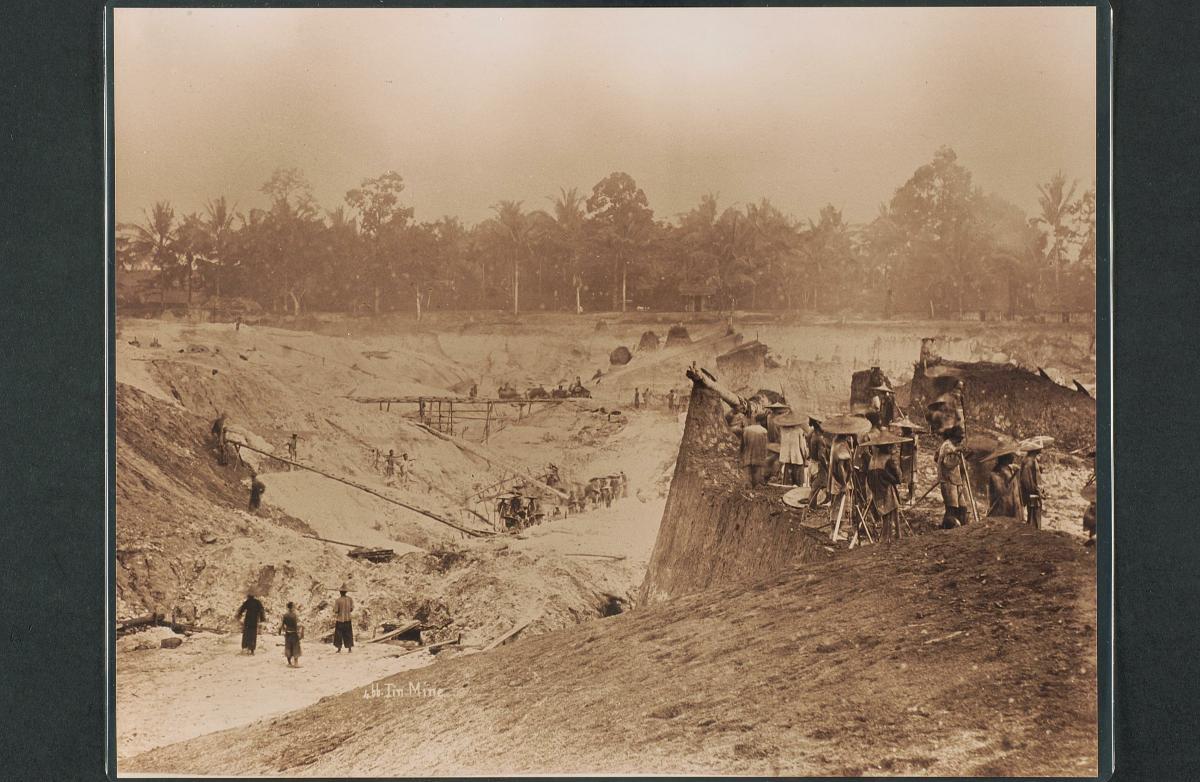 This photograph is part of a set acquired from the National Geographic Society, a non-profit scientific and educational institution. The photographs depict the sights and scenes of Singapore, Malaysia, Thailand, and Indonesia. This particular photograph shows a tin mine in Johor, Malaysia.